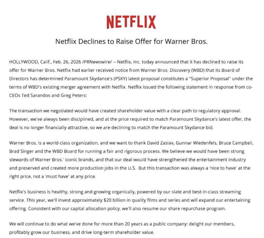 El 5 de diciembre de 2025 Netflix publicó un anuncio oficial según el cual la plataforma de streaming negoció y financió íntegramente un acuerdo definitivo para adquirir Warner Bros. incluyendo sus estudios de cine y televisión, HBO Max y HBO. La transacción en efectivo y acciones se valoró en 82.700 millones de dólares (valor de capital de 72.000 millones). Sin embargo, en realidad no se trataba de un acuerdo definitivo, ya que la puja por WBD seguía abierta, con Paramount Skydance seguía haciendo ofertas mientras tanto. El 26 de febrero, el consejo de Warner Bros. Discovery consideró que la última oferta de Paramount era "superior" al acuerdo inicial de Netflix. Con esta oferta superior, Paramount Skydance adquiriría el 100% de WBD por aproximadamente 111.000 millones de dólares. Netflix se negó a contraofertar con una oferta más alta y Paramount parece ahora preparada para poseer completamente WBD.