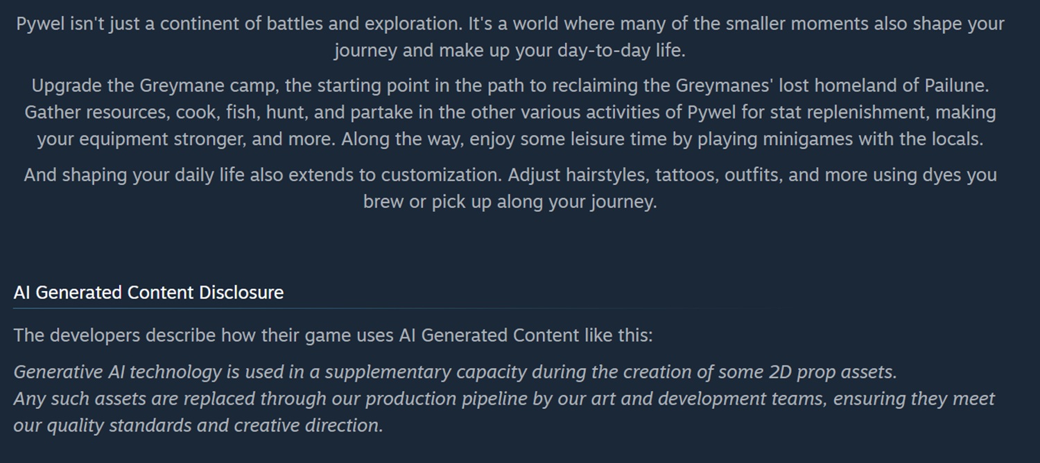 La página de Steamde Crimson Desert muestra ahora un descargo de responsabilidad, tal y como exige Valve. Dice así: "La tecnología de IA generativa se utiliza de forma suplementaria durante la creación de algunos activos de atrezo 2D" Al igual que en la publicación en las redes sociales, Pearl Abyss explica que estas imágenes de marcador de posición deben ser sólo temporales.