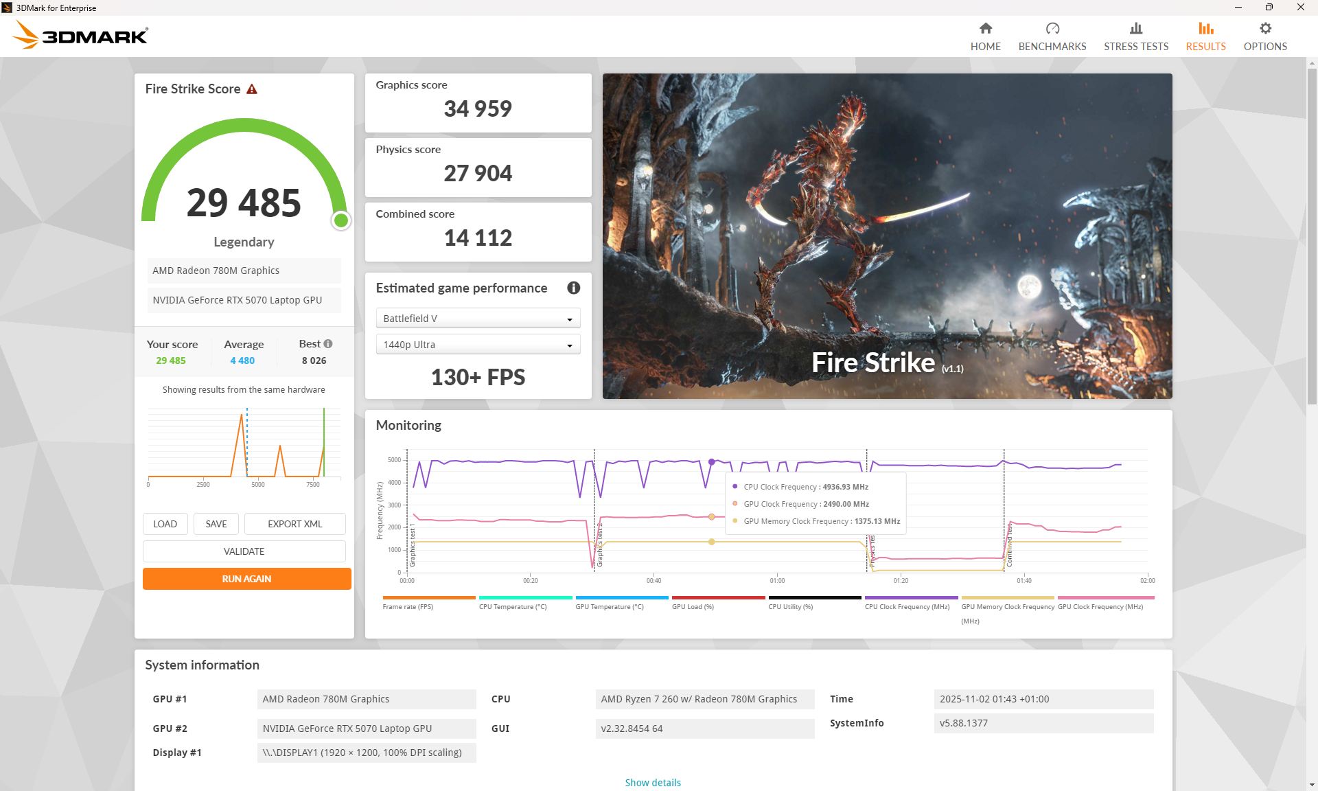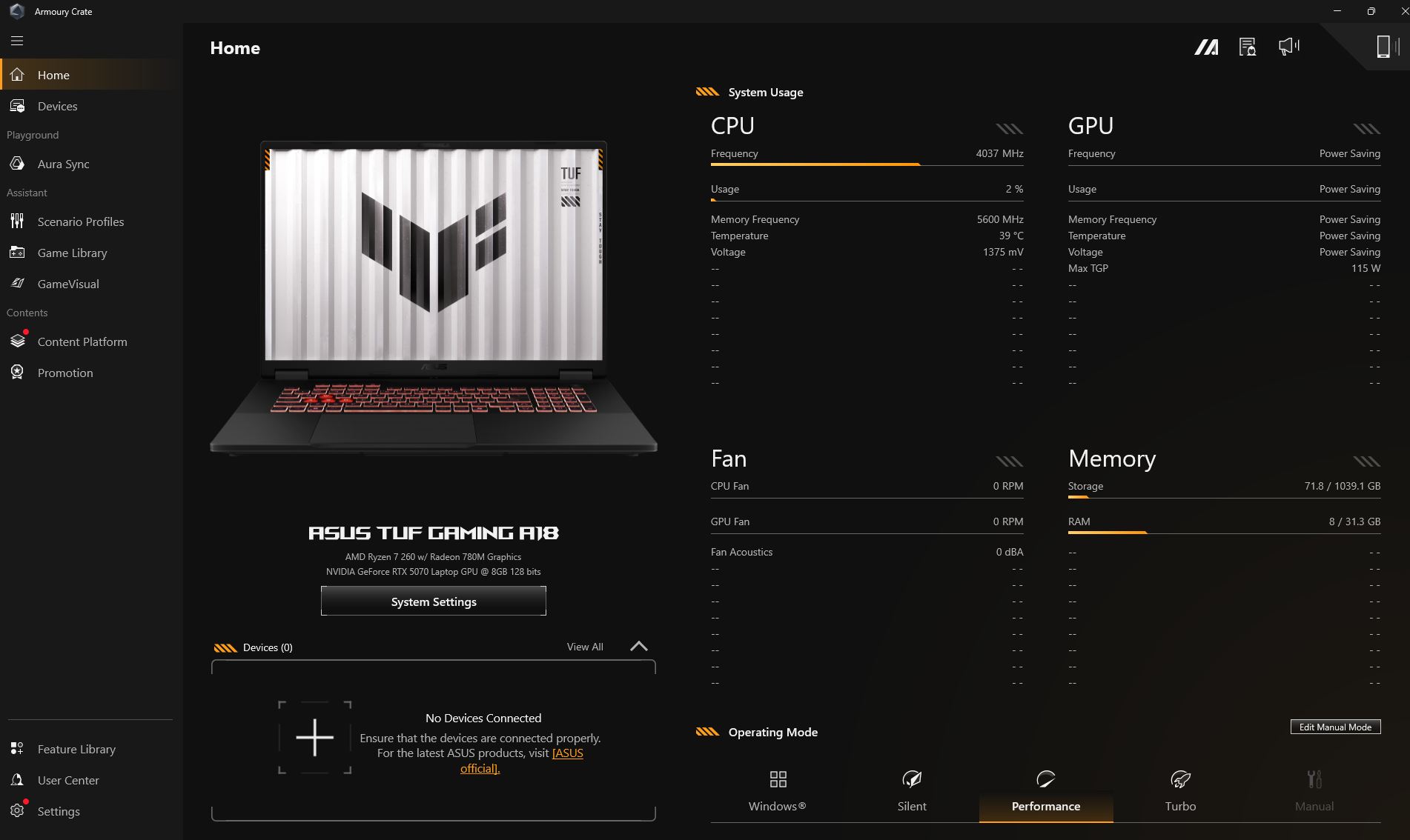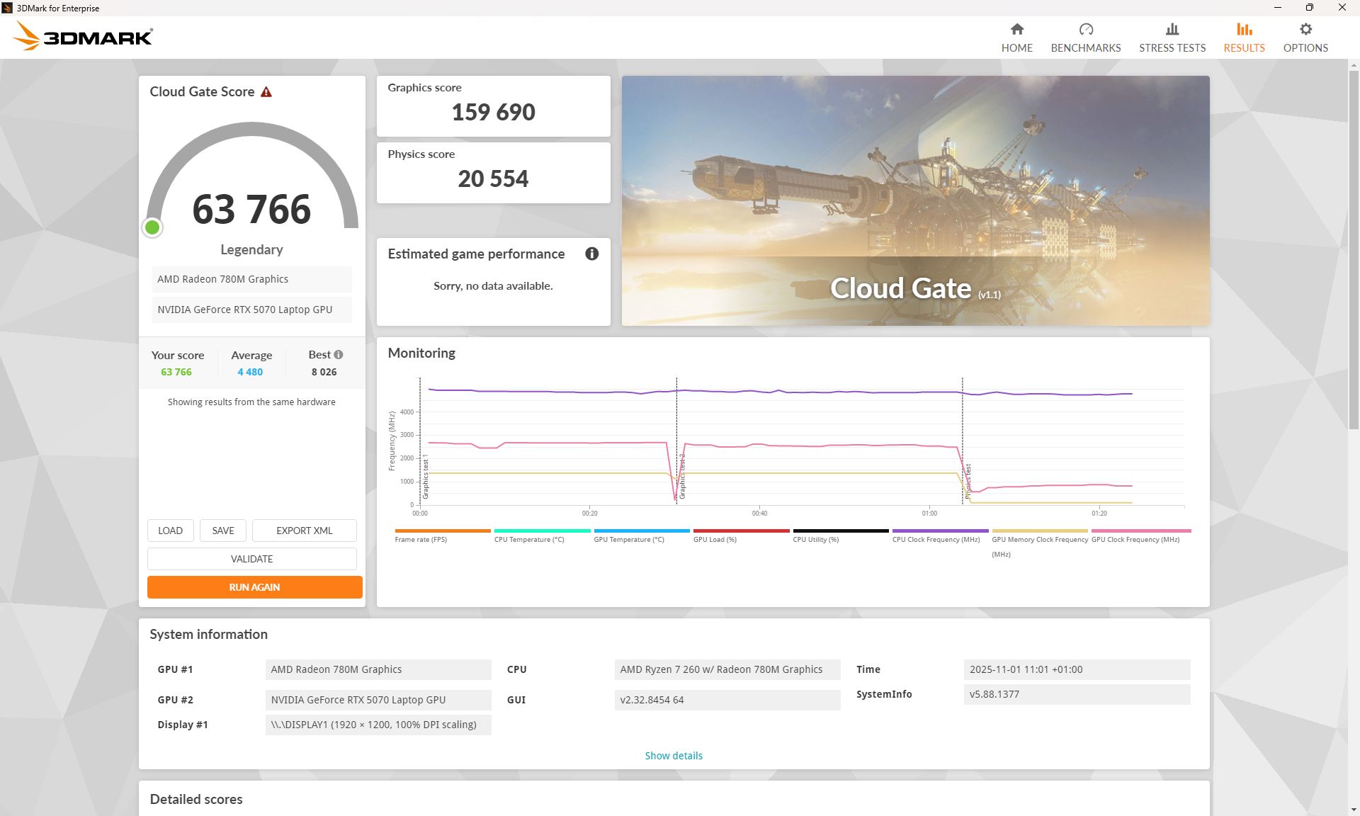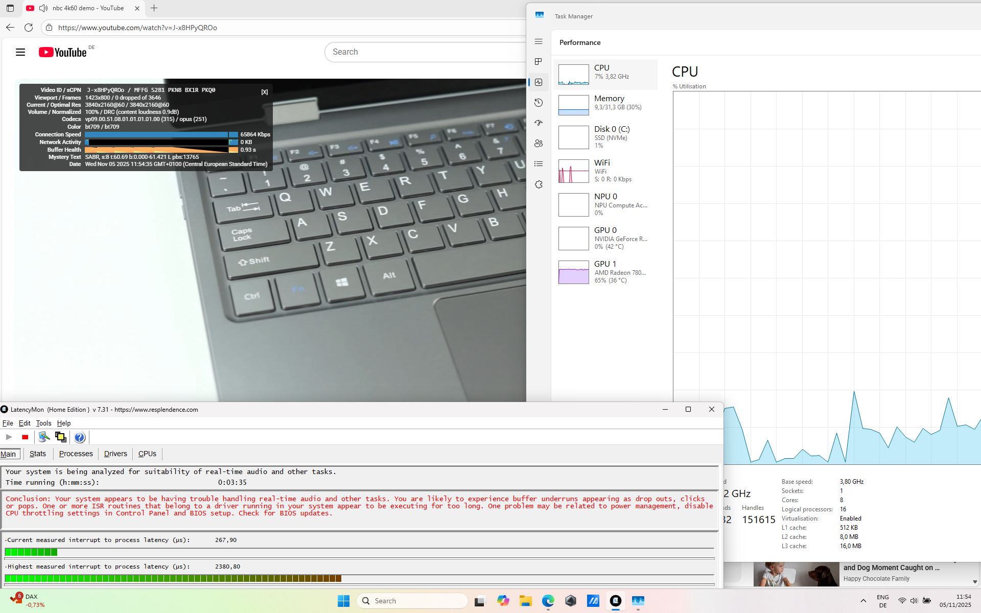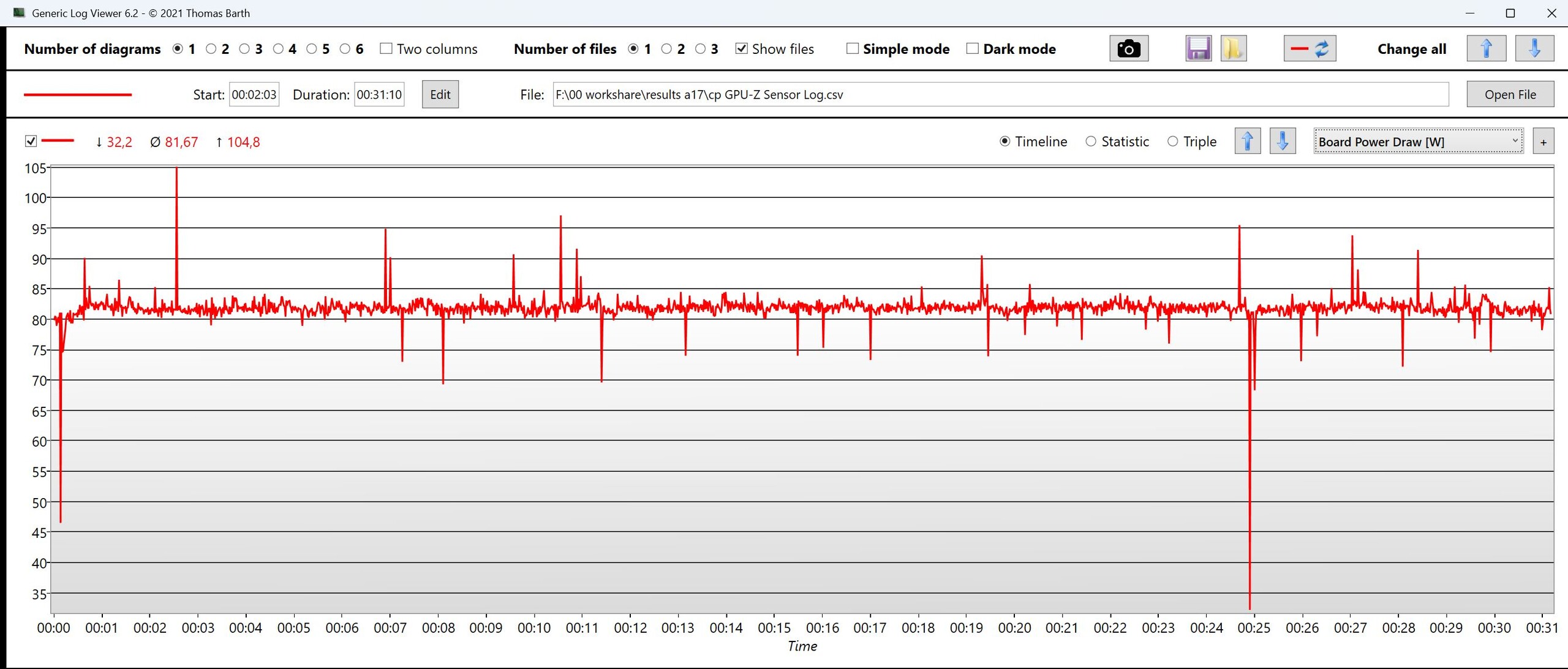 Con HDMI conectado, la dGPU permanece activa y el consumo en reposo salta a 21 W. En juegos, la A18 es muy eficiente en consumo; en modo Turbo, el consumo se alinea con el de otros modelos RTX 5070.