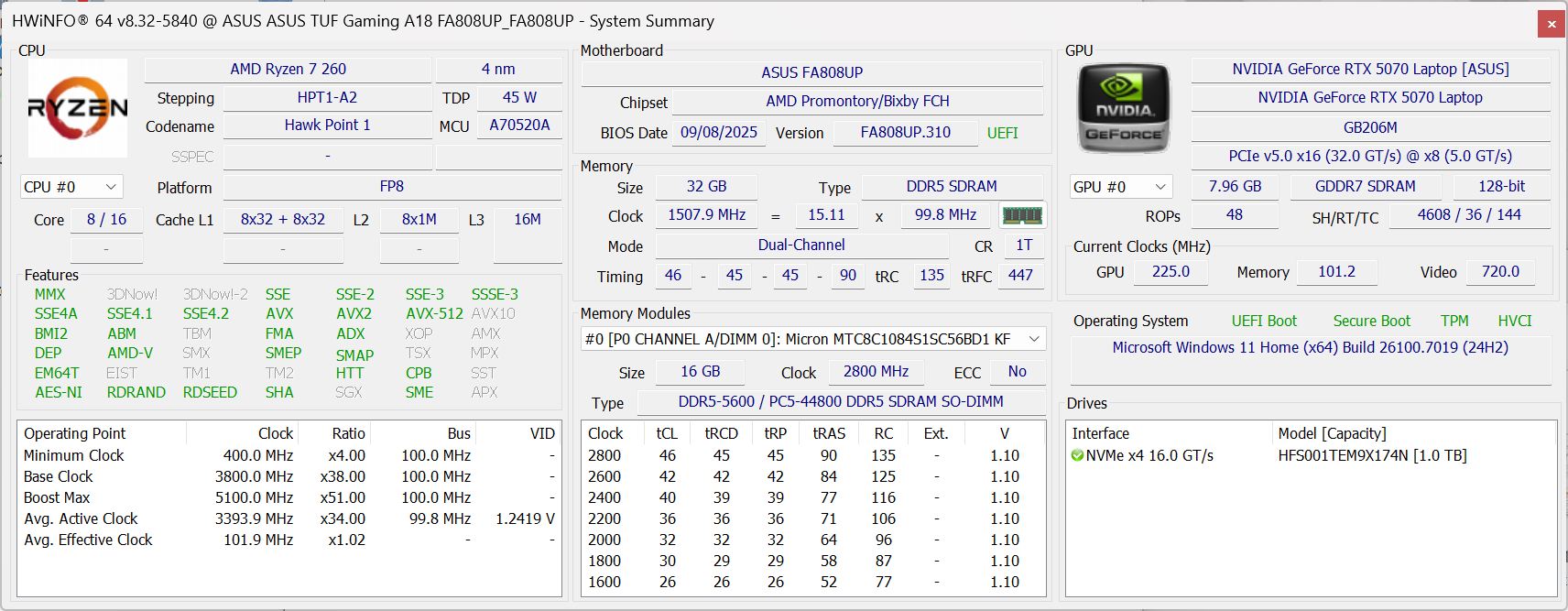 | Asus TUF Gaming A18 FA808UP-S8022W R7 260, GeForce RTX 5070 Laptop, SK hynix HFS001TEM9X174N, IPS, 1920x1200, 18" | Asus ROG Strix G18 2025 G814 R9 9955HX, GeForce RTX 5070 Laptop, Micron 2500 1TB MTFDKBA1T0QGN, IPS, 2560x1600, 18" | MSI Crosshair 18 HX AI A2XW Ultra 9 275HX, GeForce RTX 5070 Laptop, Micron 2500 1TB MTFDKBA1T0QGN, IPS, 2560x1600, 18" | HP Omen 17z-db100 Ryzen AI 7 350, GeForce RTX 5070 Laptop, TeamGroup T-Force G50 TM8FFE004T, IPS, 2560x1440, 17.3" | Lenovo LOQ 17IRX10 i7-14700HX, GeForce RTX 5070 Laptop, WD PC SN7100S SDFPMSL-1T00-1101, IPS, 1920x1080, 17.3" | MSI Katana 17 HX B14WGK i7-14650HX, GeForce RTX 5070 Laptop, Micron 2500 1TB MTFDKBA1T0QGN, IPS, 2560x1440, 17.3" | Medio NVIDIA GeForce RTX 5070 Laptop | Media de la clase Gaming | |