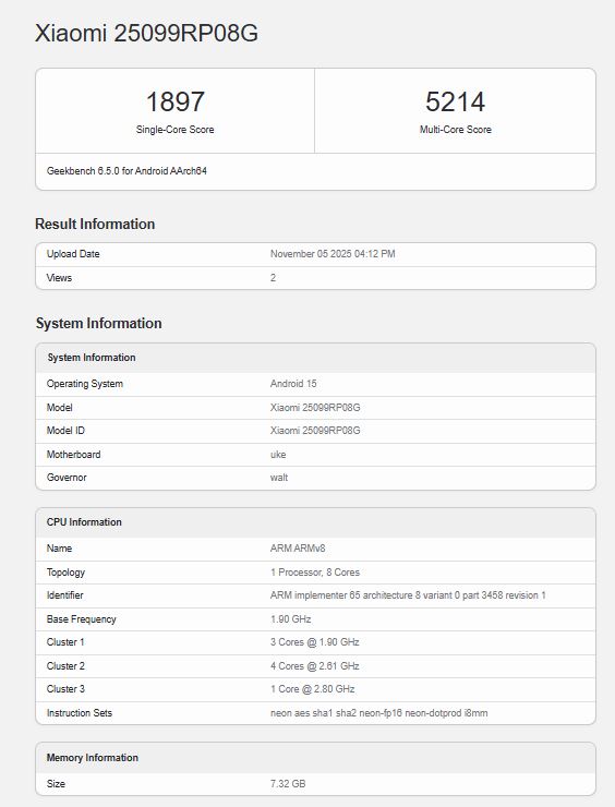 Las puntuaciones obtenidas por este nuevo dispositivo-1.897 en la prueba de un solo núcleo y 5.214 en la de varios núcleos-están también ambas a poca distancia de la Xiaomi Pad 7 en nuestras pruebas internas. Además, el listado confirma la presencia de 8 GB de RAM y Android 15 en el dispositivo.