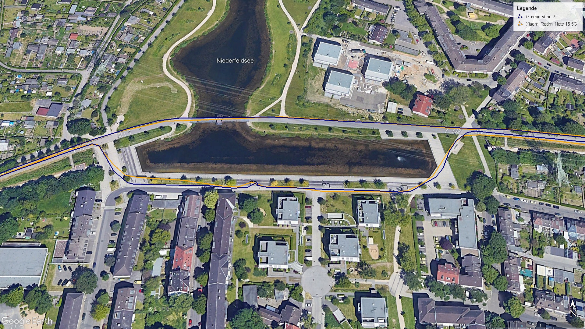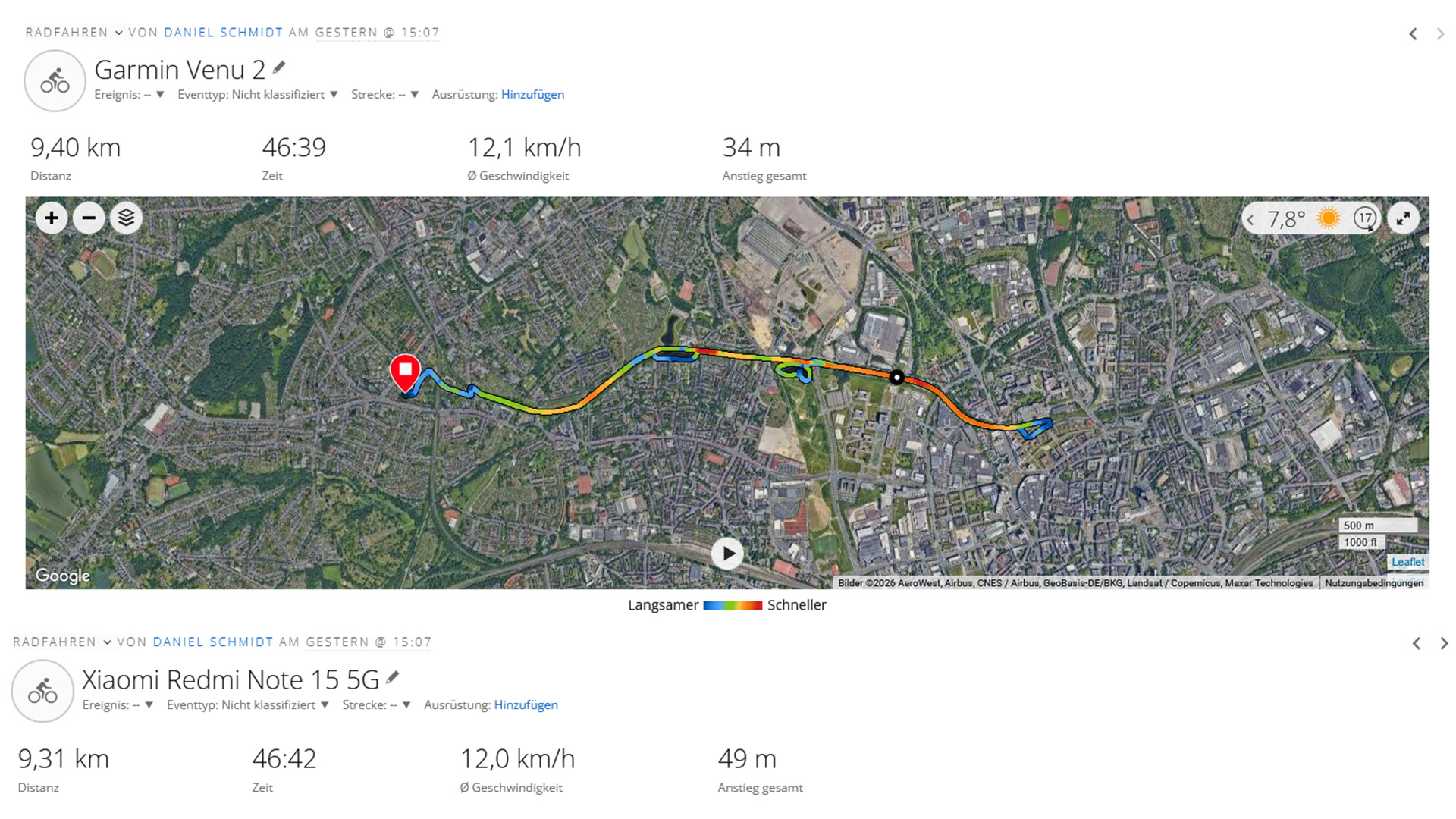 Durante un paseo en bicicleta, comparamos el smartphone Xiaomi con un smartwatch de fitness de Garmin. La ruta registrada es precisa en su mayor parte, aunque se aprecian algunas desviaciones respecto a la trayectoria real.