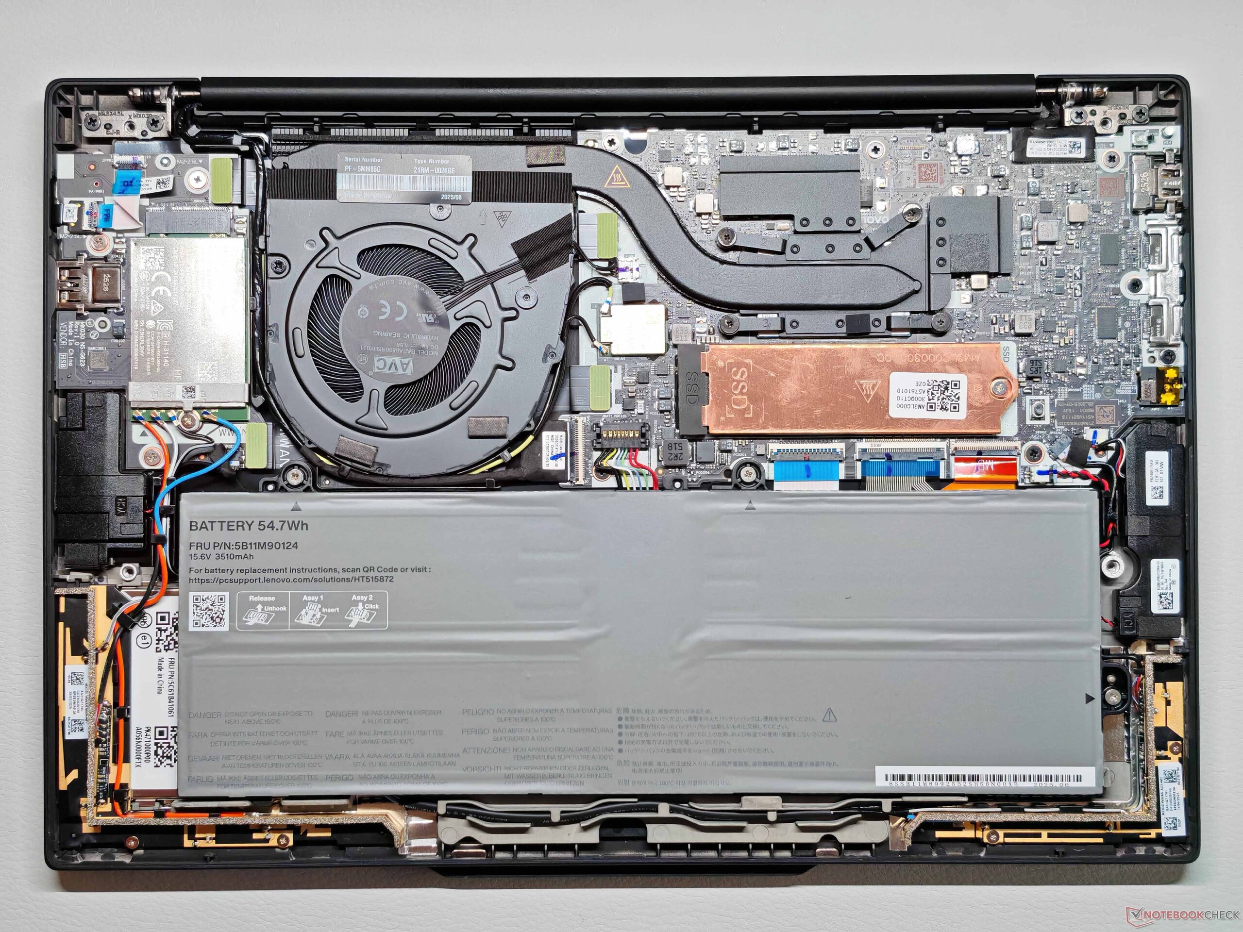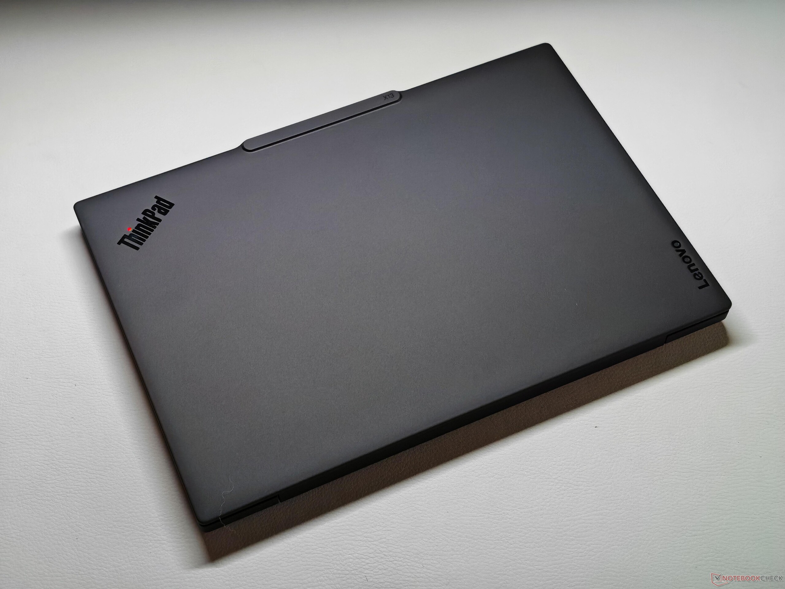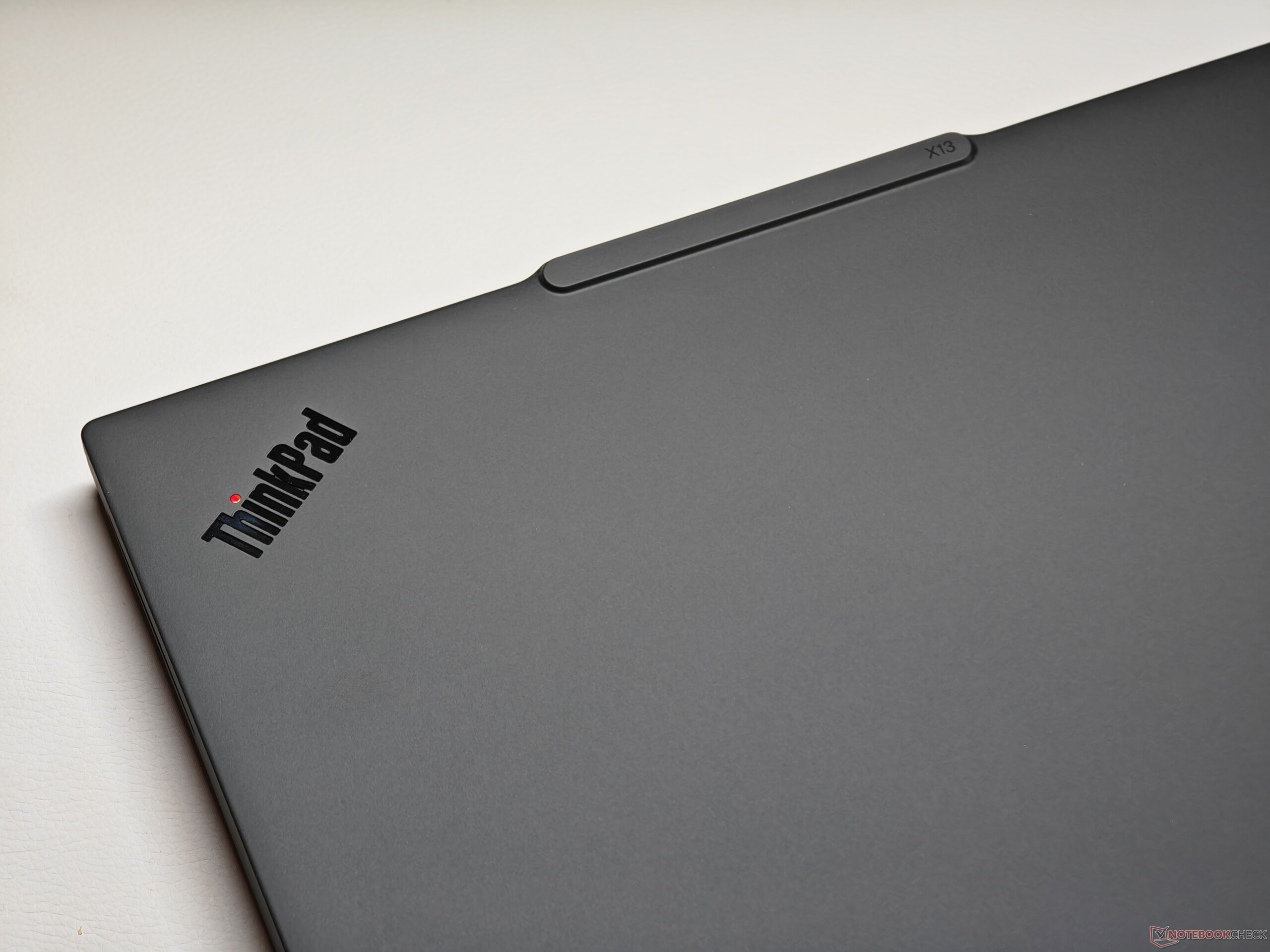 Visualmente, el nuevo X13 G6 es inconfundiblemente un ThinkPad y sigue el lenguaje de diseño actual, incluida la carcasa de la cámara, bastante prominente. Al manejar el dispositivo, su tamaño compacto y su bajo peso se aprecian de inmediato. Las superficies tienen un acabado ligeramente texturizado que da la sensación de ser de primera calidad, no es excesivamente propenso a las huellas dactilares y es relativamente fácil de limpiar. La tapa es de plástico reforzado con fibra de carbono y la unidad base es de aluminio. Sin embargo, el enfoque en la movilidad tiene un impacto en la rigidez general. La unidad base puede presionarse ligeramente en la zona central y produce leves crujidos al girarla. La tapa en sí es razonablemente robusta, pero las bisagras son el principal problema. El ángulo máximo de apertura es de 180 grados, pero las bisagras están demasiado sueltas y se tambalean demasiado. La cubierta inferior se fija con sólo cuatro tornillos y es fácil de quitar. El ventilador, la batería, el módulo WWAN y la SSD son reparables, aunque la RAM y el módulo WLAN están soldados.