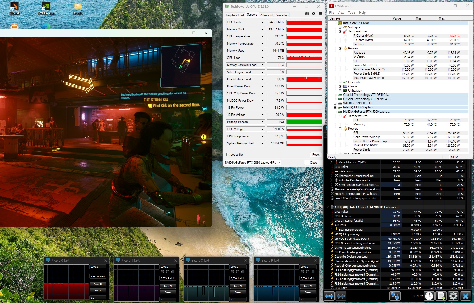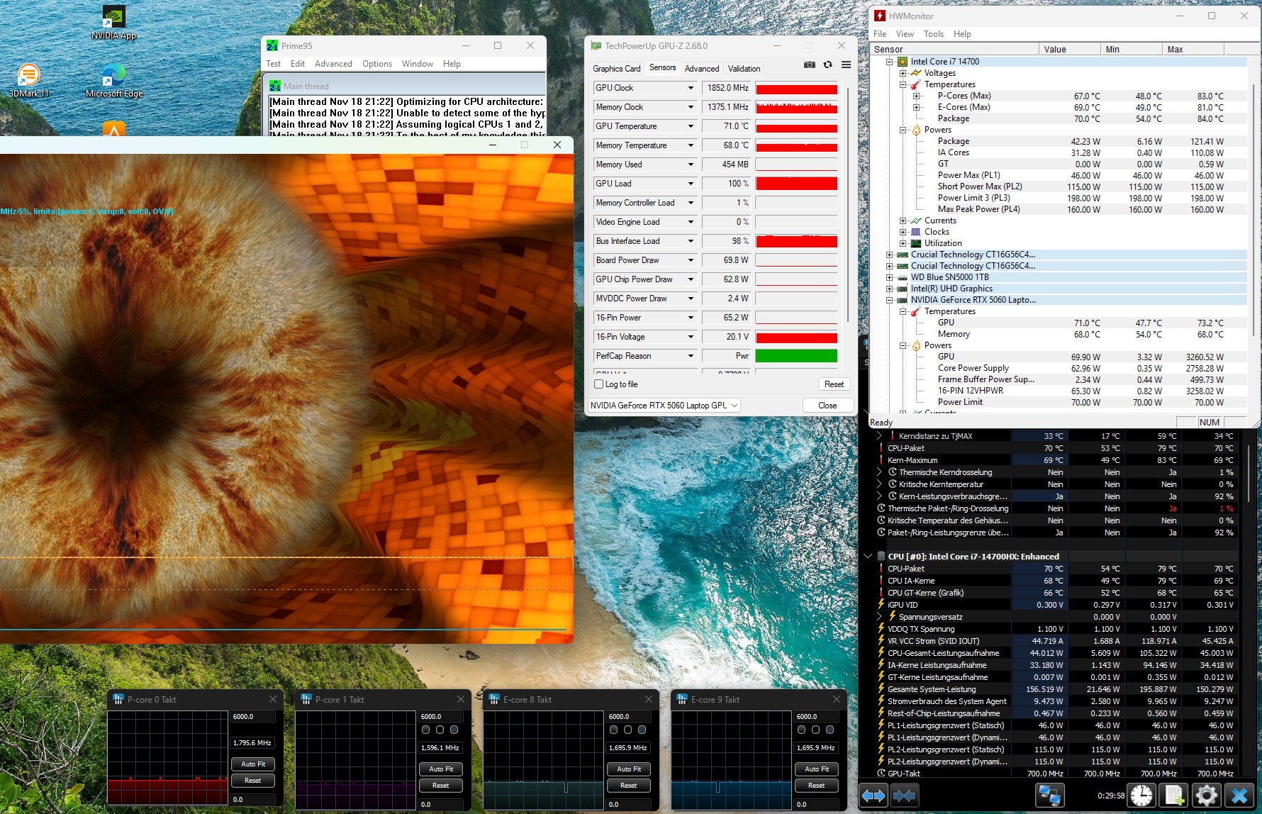 El Core i7-14700HX de ralentización completó la prueba de estrés combinada Furmark y Prime95 a unos 70 °C, lo que es completamente inofensivo. La GeForce RTX 5060 también se niveló en torno a los 70 °C.