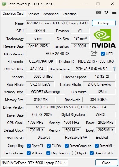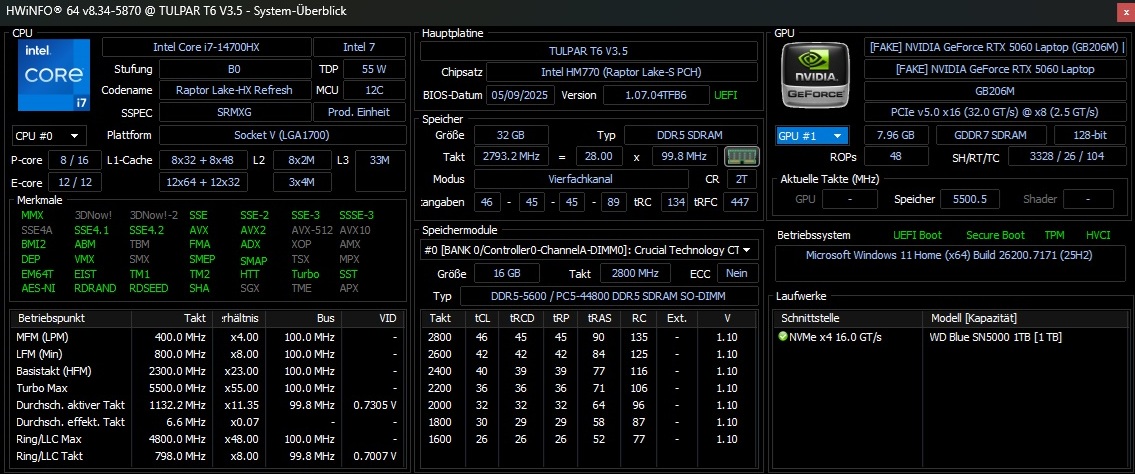 | Tulpar T6 V3.5 Intel Core i7-14700HX ⎘ NVIDIA GeForce RTX 5060 Laptop ⎘ 32 GB Memoría, 1000 GB SSD | Precio de catálogo: 1160 EUR | 2.4 kg | 25 mm | 16.00" 1920x1200 142 PPI IPS | |