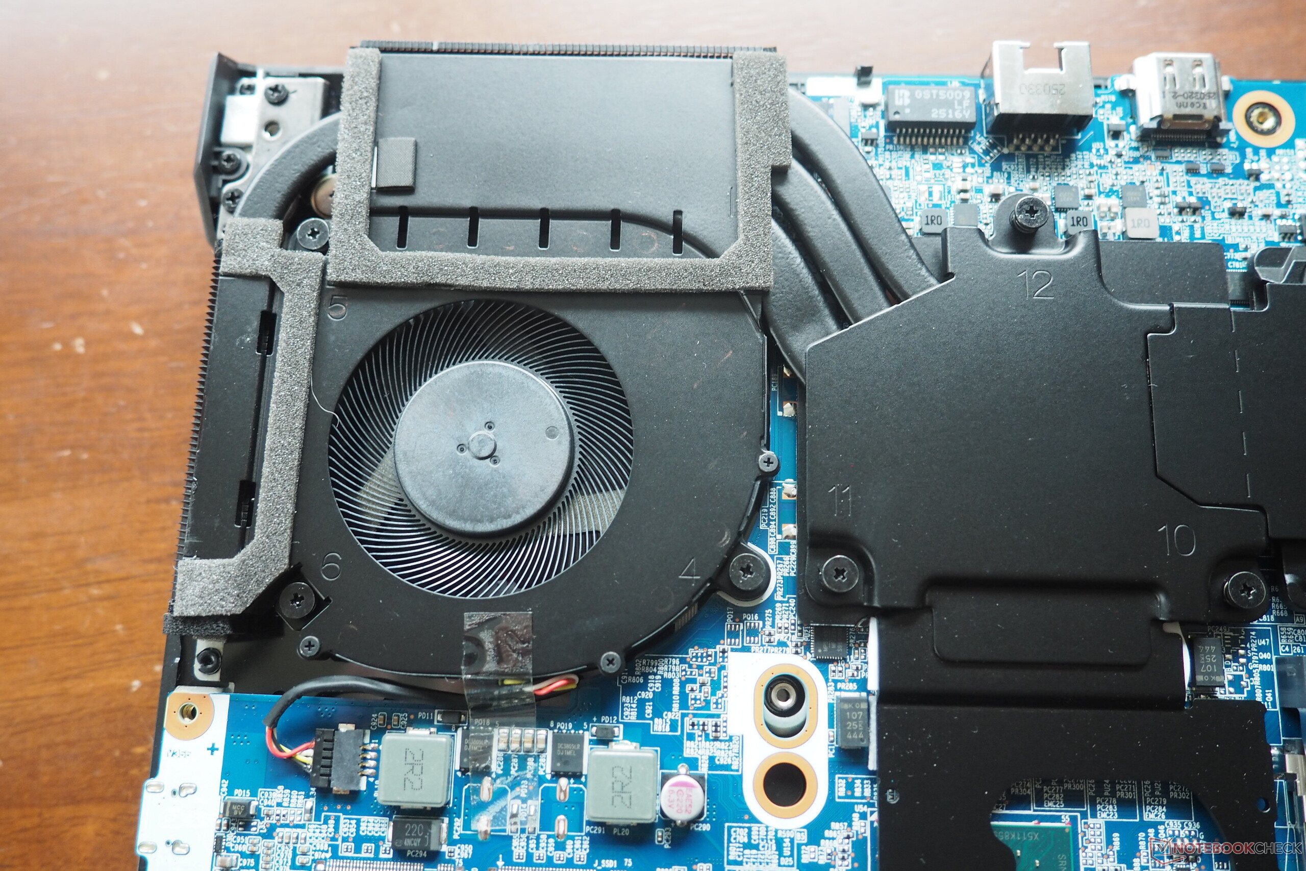 Hay que retirar un total de doce tornillos Phillips antes de poder hacer palanca para sacar la cubierta inferior de sus soportes. Bajo el capó, encontrará un sistema de refrigeración con dos ventiladores, junto con dos ranuras para RAM y dos ranuras para SSD. La batería también es accesible desde aquí.