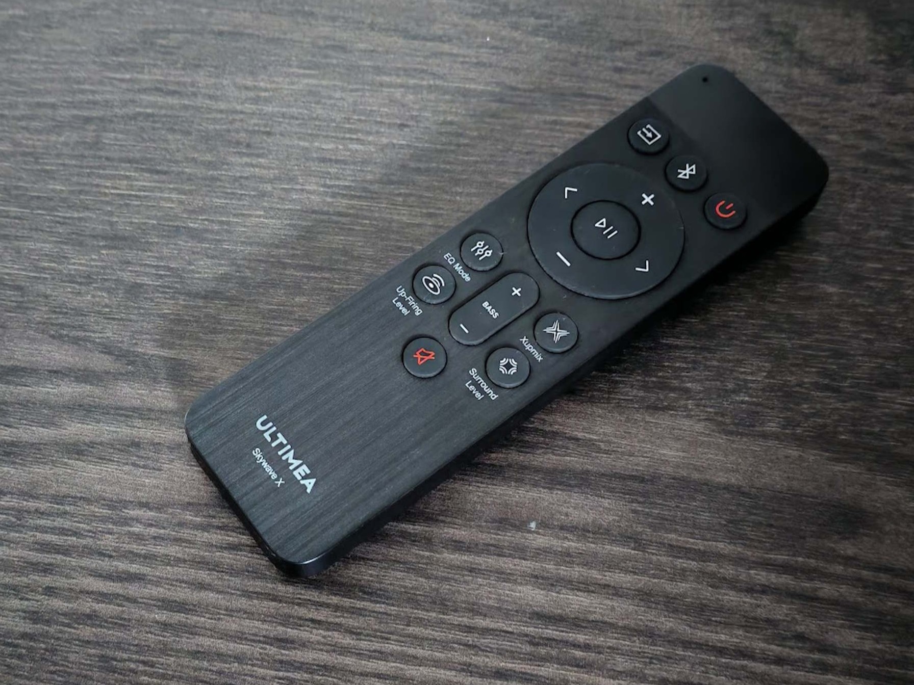 En la parte superior de la barra de sonido se encuentran los botones de selección de fuente, encendido/apagado y control de volumen. El mando a distancia ofrece las mismas funciones y también incluye botones para la selección rápida del ecualizador, el ajuste de la intensidad de los graves, la potencia de los transductores de tiro ascendente, el efecto envolvente y la activación de Xupmix. El mando a distancia da la sensación de ser bastante robusto, pero por lo demás no es nada destacable.