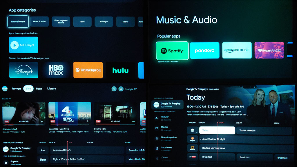 El TCL C1 ejecuta Google TV OS y venía con la versión 11 instalada. Los principales servicios de streaming, como Netflix y YouTube, funcionaron como se esperaba, de forma similar a otros dispositivos que funcionan con Google TV. Los propietarios pueden elegir configurar el proyector con o sin inicio de sesión, y la disposición de la pantalla de inicio variará en función de esta elección.