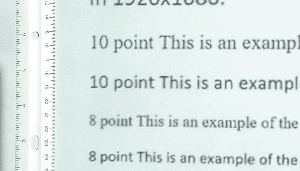 Cuando se conecta a un ordenador, el texto de cuatro puntos y de mayor tamaño es legible, por lo que el TCL C1 puede utilizarse como pantalla externa para PC. Los píxeles se hacen visibles al acercarse a la imagen proyectada a 1 m (3,3 pies) o menos, pero en general no son perceptibles a distancias de visión normales. La pixelización se vuelve intrusiva con textos pequeños de menos de seis puntos de tamaño. Las rampas de grises no son perfectamente suaves, pero las bandas de color visibles se limitan generalmente a las sombras oscuras y a las zonas planas de color.