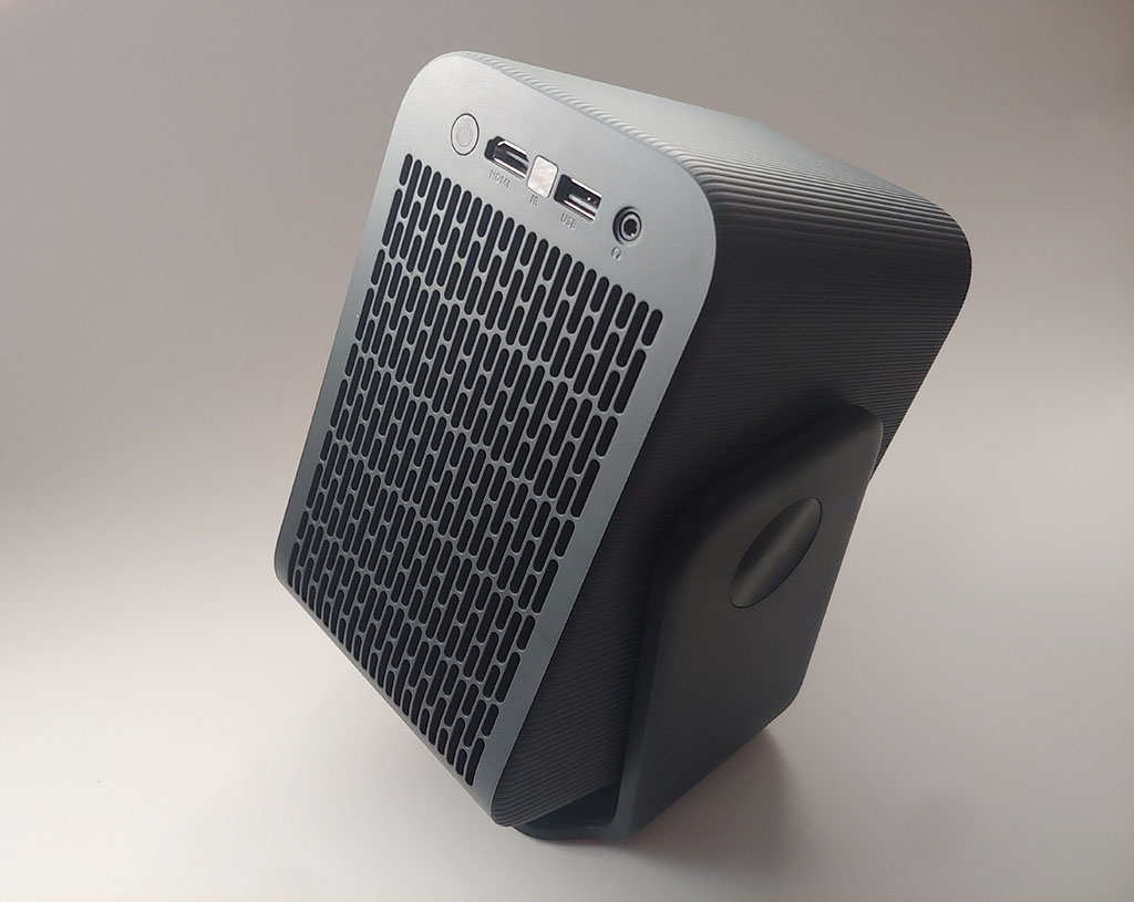 El TCL C1 tiene unas dimensiones similares a las de una pequeña tostadora de dos rebanadas y pesa aproximadamente lo mismo que un litro de leche. Su cuerpo de plástico totalmente gris incorpora bordes redondeados con un sutil dibujo de espiga modificado que adorna la parte superior y los laterales. A los propietarios les resultará fácil encontrar espacio para este proyector en mesas pequeñas gracias a una huella aproximadamente igual a la de una caja de CD.