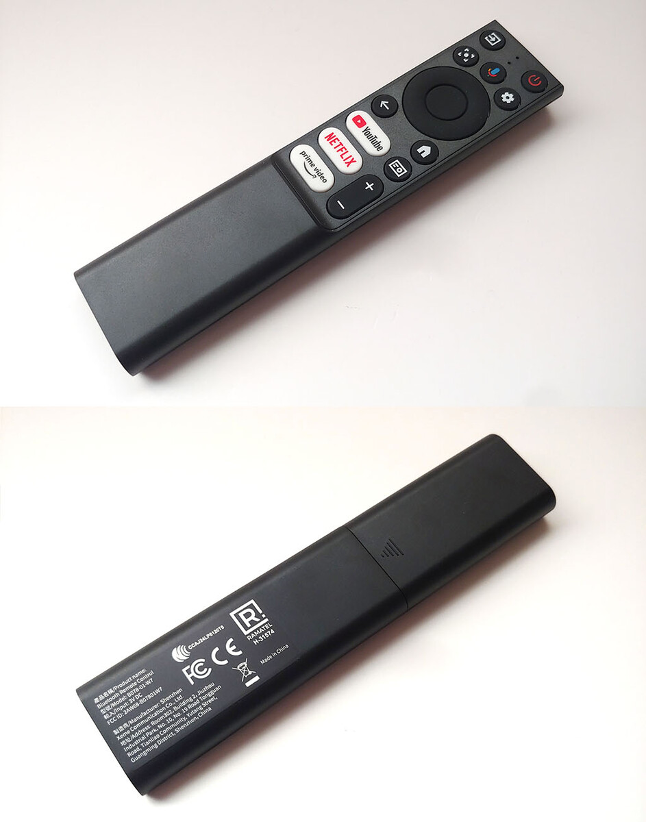 El mando a distancia incluido es de plástico, con un diseño de doble nivel que sitúa los botones de volumen en un nivel superior al de los botones principales. Todos los botones tienen un recorrido corto y una respuesta nítida, con una buena legibilidad a la distancia del brazo. Los botones no están retroiluminados ni brillan en la oscuridad. La parte posterior del mando a distancia está ligeramente texturizada para un mejor agarre, lo que ayuda al retirar la tapa para sustituir las dos pilas AAA. El receptor de infrarrojos está situado junto a los puertos traseros, aunque el mando a distancia es lo suficientemente potente como para que no sea necesario apuntar directamente a la TCL C1 para controlarla.
