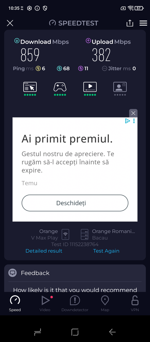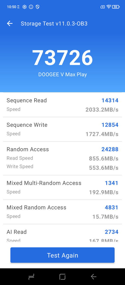 Su chip de almacenamiento de 512 GB es impresionantemente rápido, con unas lecturas secuenciales de ~2 GB/s. Los 16 GB de RAM y el SoC utilizado son suficientes para la mayoría de las tareas, también; AnTuTu cree que el V Max Play probado está construido alrededor del Mediatek Dimensity 7300Xde Mediatek, que no es muy diferente del Dimensity 7300. Ambos cuentan con 4 núcleos "grandes" y 4 "pequeños" con velocidades de reloj moderadas.