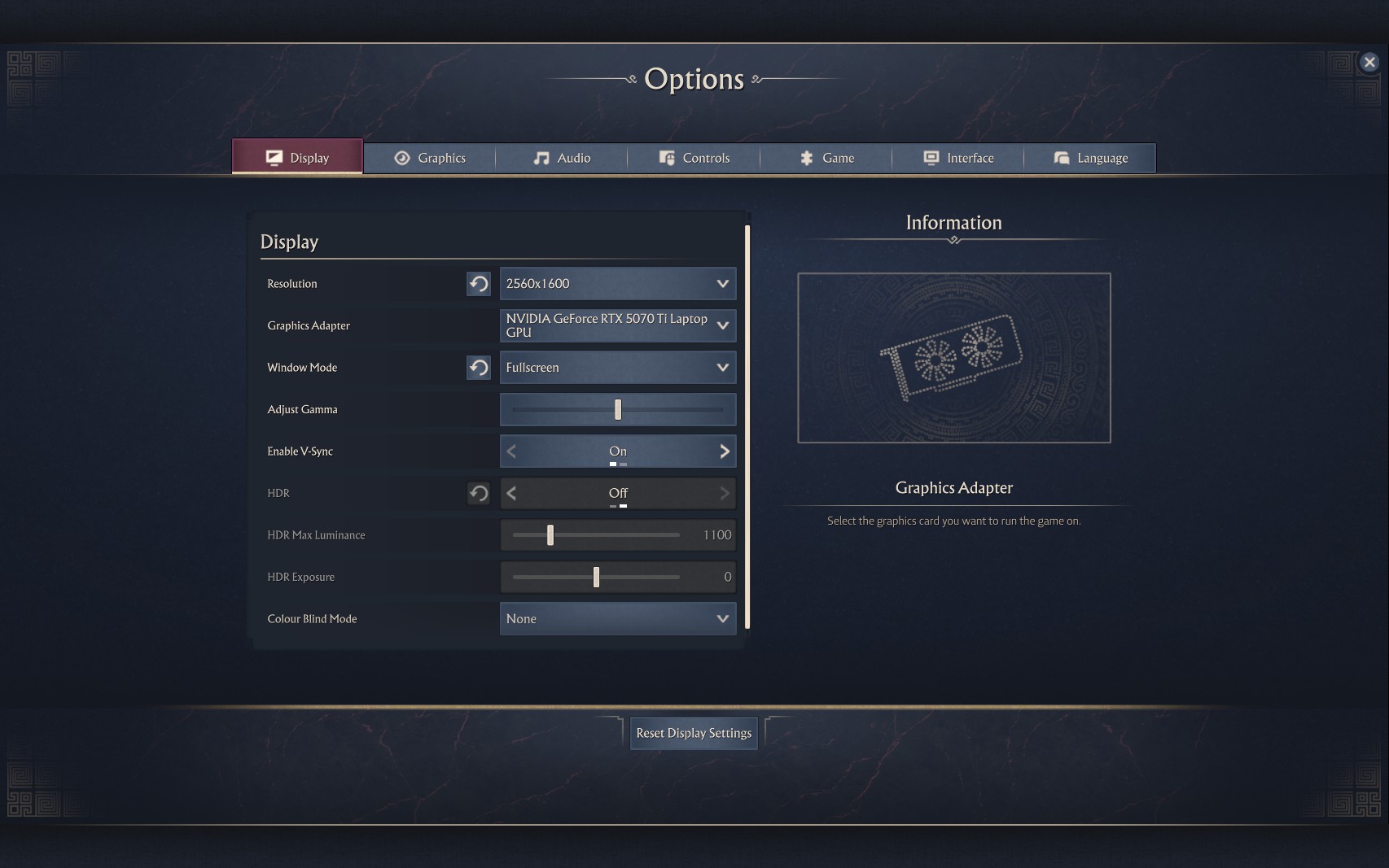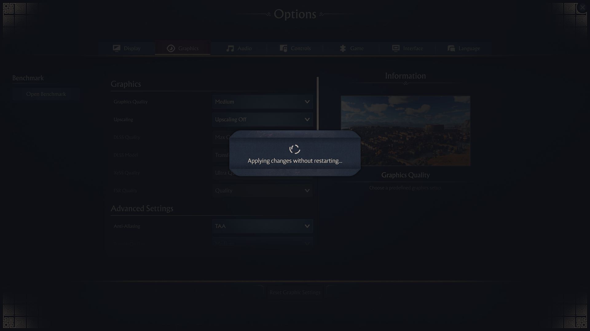 El menú de opciones en dos partes (ajustes de pantalla y gráficos) ofrece todas las opciones habituales y, afortunadamente, aplica los cambios sin necesidad de reiniciar. Sin embargo, aplicar los nuevos ajustes por primera vez puede llevar algo más de tiempo; en nuestro caso, tuvimos que esperar hasta un minuto.