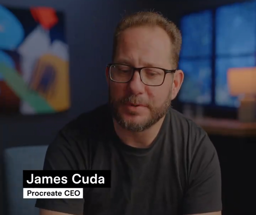 En el vídeo, el consejero delegado de la empresa, James Cuda, expresa su desagrado por la IA generativa, afirmando que las funciones de Procreate "siempre se han diseñado y desarrollado con la idea de que un humano creará algo". La postura se reitera en el sitio web de la empresa con la audaz afirmación: "La IA no es nuestro futuro".
