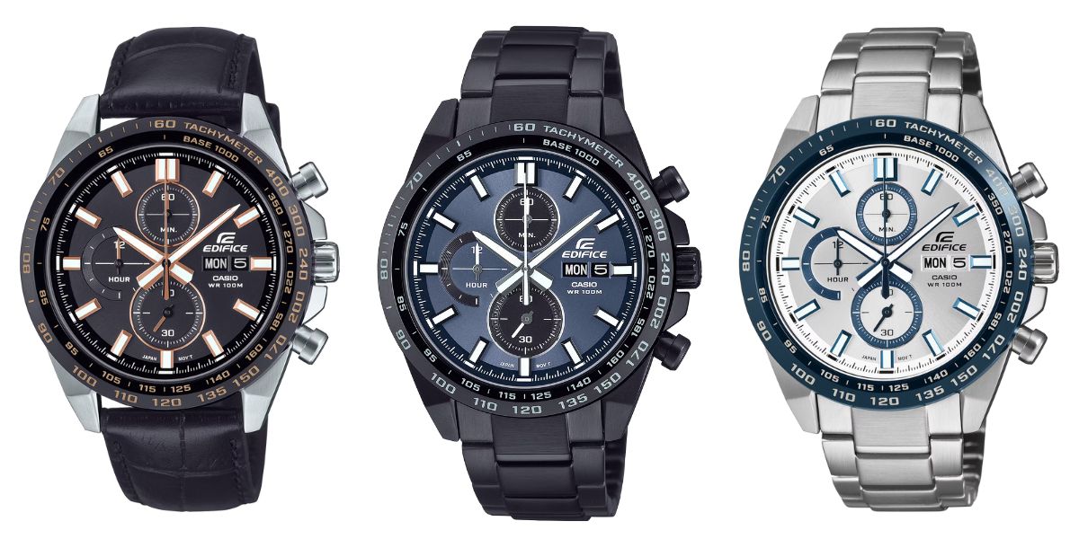 Los nuevos cronógrafos Casio Edifice EFR-574 son el EFR-574BL-1AV, el EFR-574DC-2AV y el EFR-574DE-7AV. Estos relojes tienen biseles taquimétricos chapados en iones, con caja y correas de acero inoxidable. El modelo analógico tiene tres agujas para la hora, los minutos y los segundos del cronómetro, y un trío de esferas insertables vinculadas a la funcionalidad del cronómetro. Además, hay indicadores de día y fecha en la esfera, y estos relojes son resistentes al agua hasta 100 m.