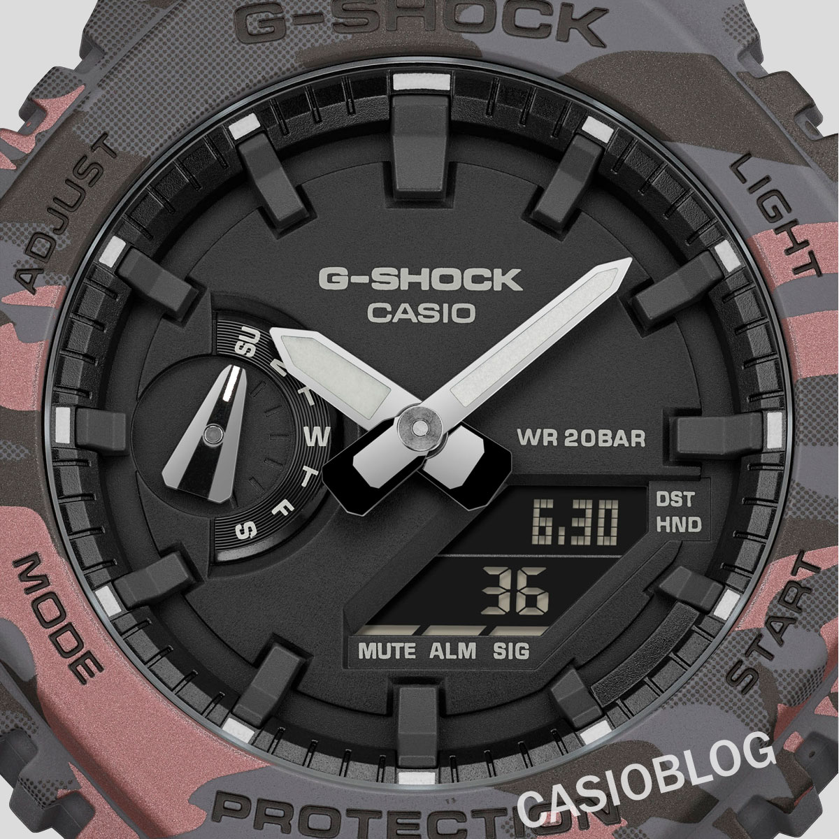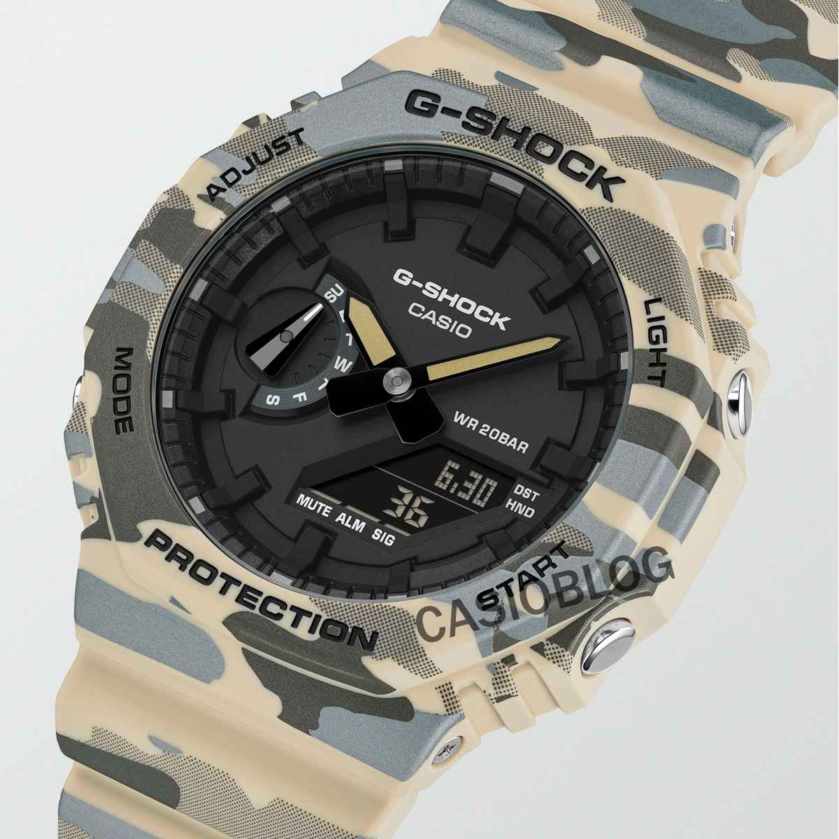 Como puede ver en las imágenes adjuntas, Casio se inclina fuertemente por la estética táctica, con ambos modelos presentando pantallas invertidas (en negativo), emparejadas con correas y biseles engalanados con patrones de camuflaje militar. El GA-2100CM-8A luce un camuflaje de topos malvas y grises, mientras que el GA-2100CM-5A opta por un camuflaje de arena y beige inspirado en el desierto. Según Casioblog, los patrones punteados que aparecen junto a las rayas de camuflaje se aplican mediante tecnología de pintura láser para crear un efecto 3D.
