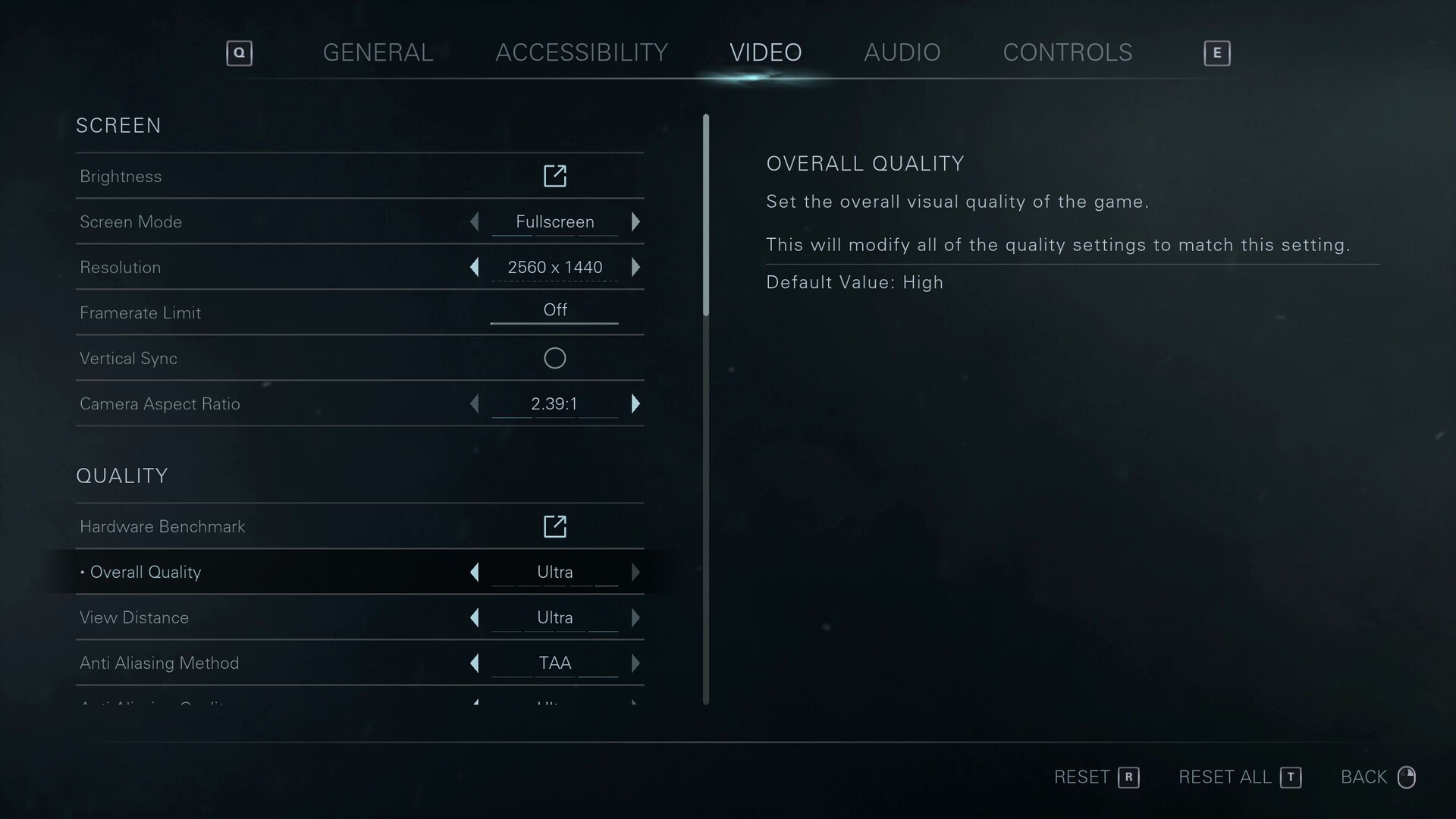 Esto nos lleva a las opciones gráficas. Desde la perspectiva de un PC, éstas son satisfactorias, es decir, bastante amplias. El menú de vídeo comienza con varios ajustes de pantalla (resolución, límite de velocidad de fotogramas, V-Sync, modo de imagen, ...). Nuestras mediciones se realizaron utilizando el 2,39:1 predeterminado, lo que significa barras negras en la parte superior e inferior (Forajidos de Star Wars envía sus saludos). El menú de opciones continúa con unos 10 ajustes de calidad, que pueden ajustarse cómodamente de una sola vez mediante un preajuste. La paleta aquí va de Baja a Ultra, aunque sólo describiríamos el juego como realmente respetable en Alta.
