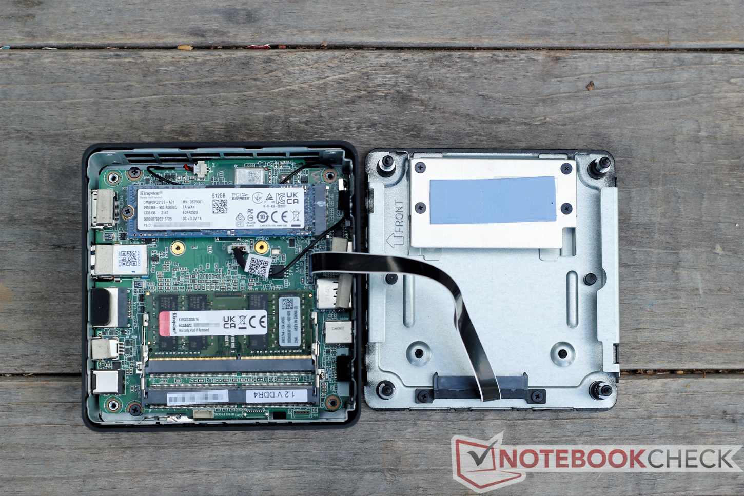 Una vez dentro, los usuarios tienen acceso a la bahía vacía de la unidad SATA de 2,5 pulgadas, el SSD PCIe y dos ranuras SODIMM DDR4 (una de las cuales está poblada fuera de la caja). Es necesario desmontar más para acceder al procesador soldado para refundirlo, pero es difícil sacar la placa base.