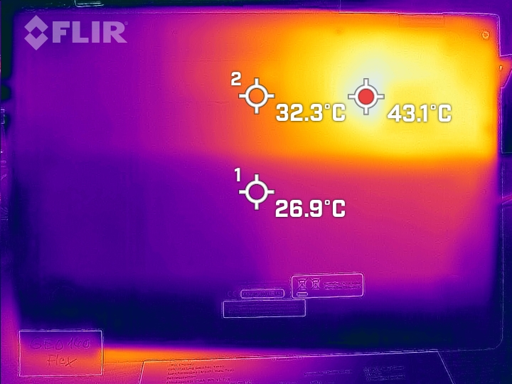 El convertible puede convertir un máximo de 24 vatios de potencia. Sin embargo, esta baja potencia hace que las superficies del portátil se calienten considerablemente. Medimos hasta 48 °C en la parte inferior. Dado que una placa de cobre relativamente grande disipa el calor del procesador, la carcasa no sólo se calienta en ciertos puntos, sino que casi una cuarta parte de la parte inferior del GeoFlex 140 puede desarrollar una temperatura incómodamente alta.
