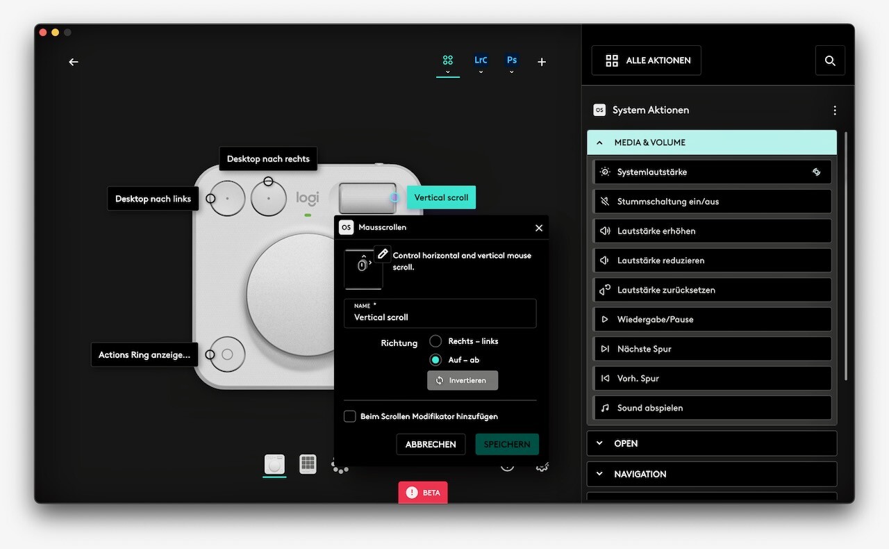 Por supuesto, también puede personalizar los preajustes desde el mercado tanto en el teclado como en la rueda giratoria. Las opciones van desde ajustes del sistema como el brillo de la pantalla o el pegado desde el portapapeles hasta la visualización de la hora, la fecha o la fase lunar con un clic del ratón o un atajo de teclado. En particular, la configuración del aspecto de cada uno de los botones LCD en el software Logitech Options Plus sigue resultando un poco complicada, pero las funciones para los dos dispositivos MX Creative Console en Options Plus estaban aún en fase beta en el momento de la prueba.