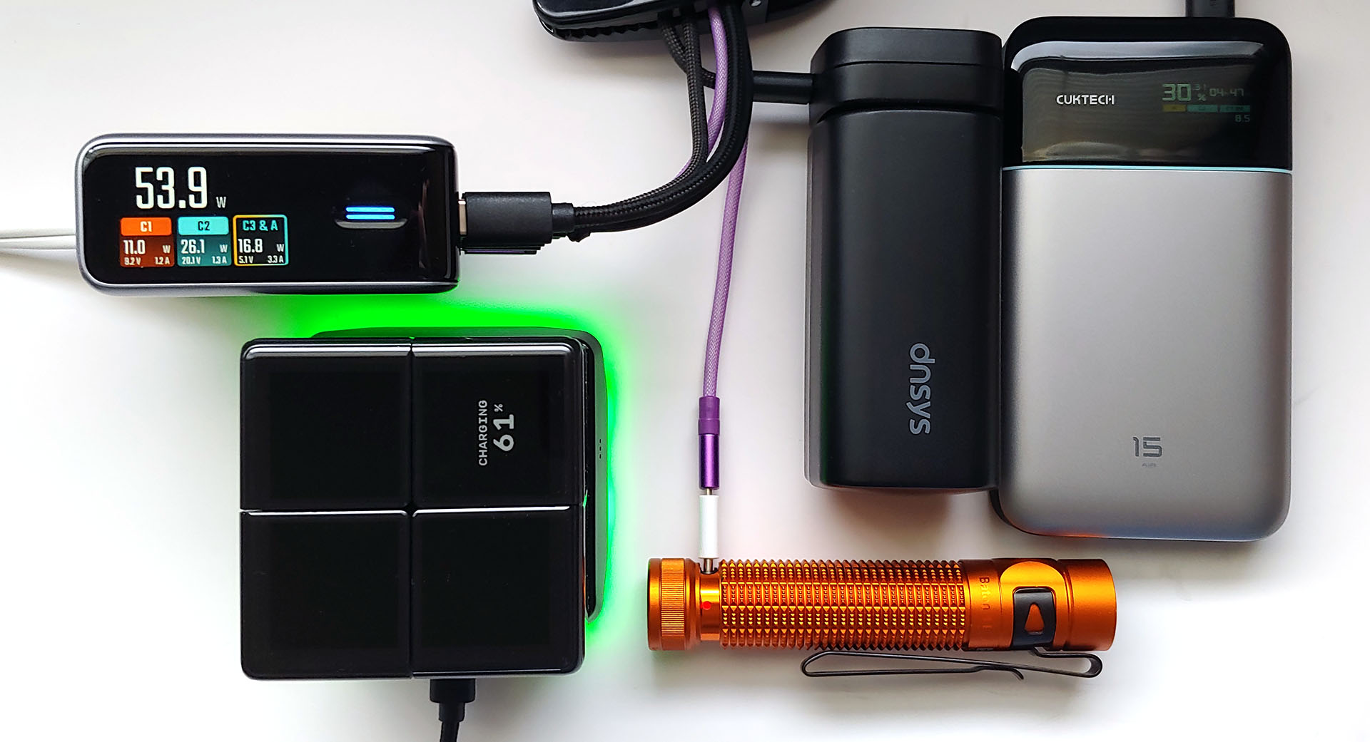 El cargador de CA no tuvo ningún problema para cargar o alimentar simultáneamente una gran variedad de dispositivos, incluidos teléfonos inteligentes, bancos de energía, radios, auriculares, ordenadores portátiles y juguetes, a velocidades similares o más rápidas que los cargadores OEM. Durante las pruebas, la salida máxima durante la carga multidispositivo se alcanzó cuando no se utilizó el puerto USB-A.