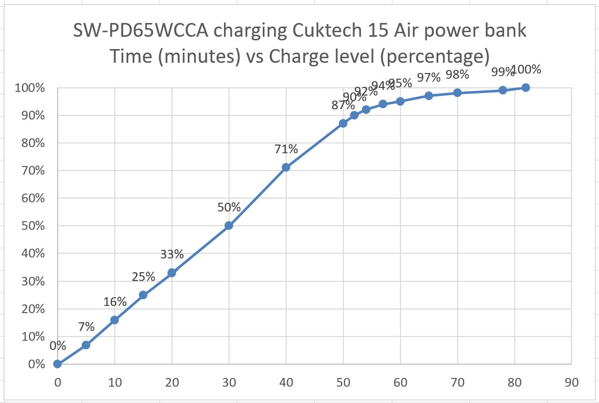 Un banco de potencia Cuktech 15 Air (57,75 Wh) alcanzó la carga completa ligeramente más rápido -unos cinco minutos de diferencia- con un Cuktech 10 Ultra (salida USB-C de 100 vatios como máximo) frente a un SW-PD65WCCA (salida USB-C de 65 vatios como máximo) mientras utilizaba el cable USB-C de 6A incluido. La velocidad de carga no fue lineal porque la mayoría de las baterías de iones de litio se cargan a un ritmo más rápido del 0% al 80%, y luego más lento hasta el 100% por seguridad.