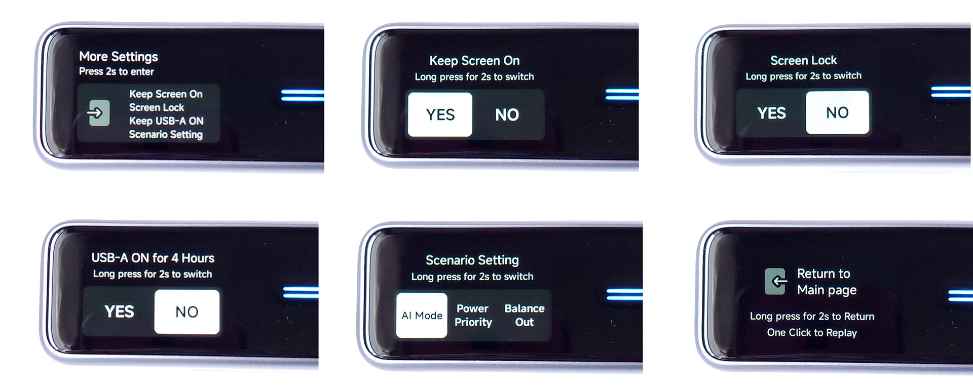 Cuando se visualizan los ajustes, una pulsación de dos segundos alterna el estado de cada ajuste. El principal ajuste a tener en cuenta es el modo de suministro de potencia: AI, Prioridad de potencia o Equilibrado.