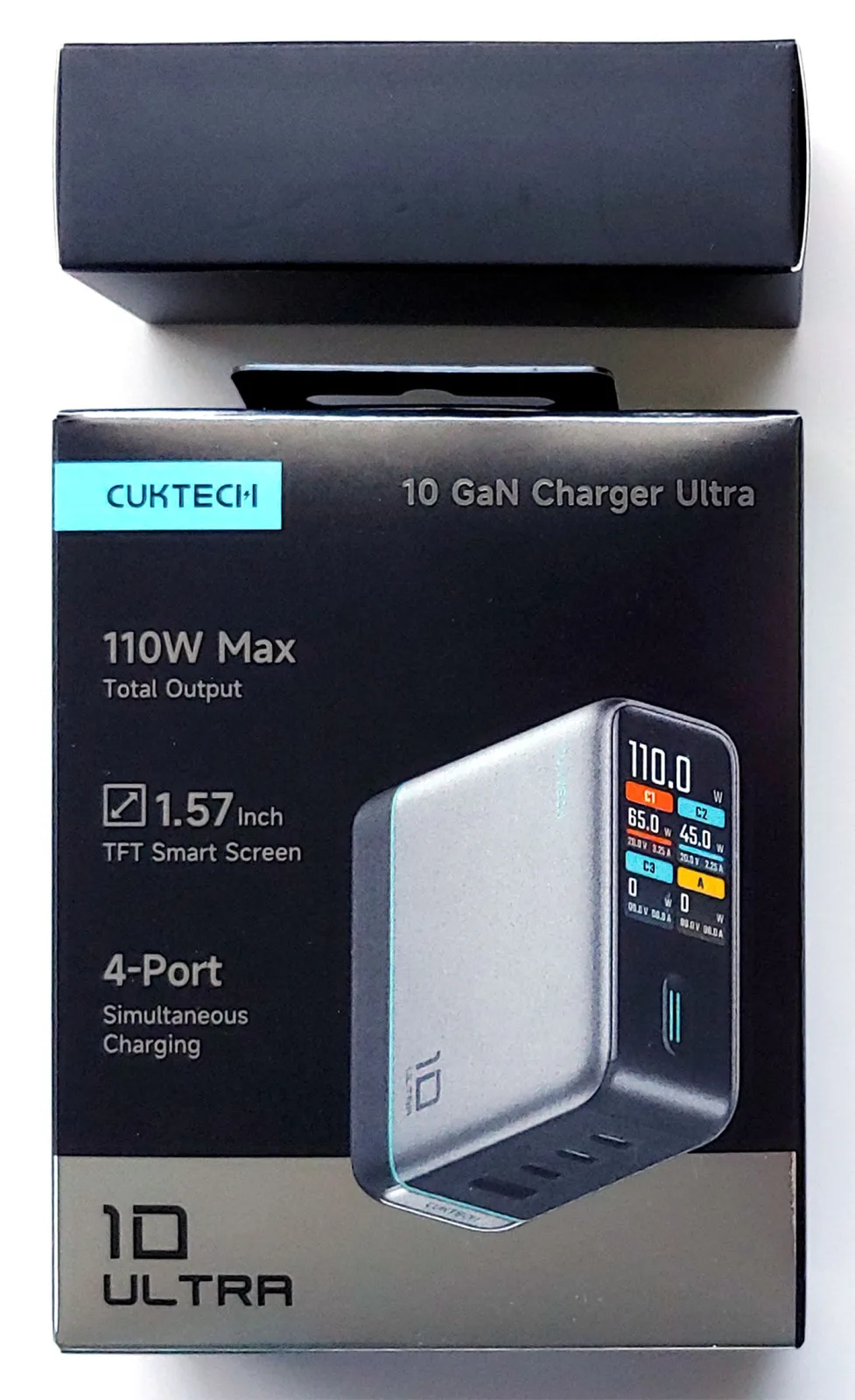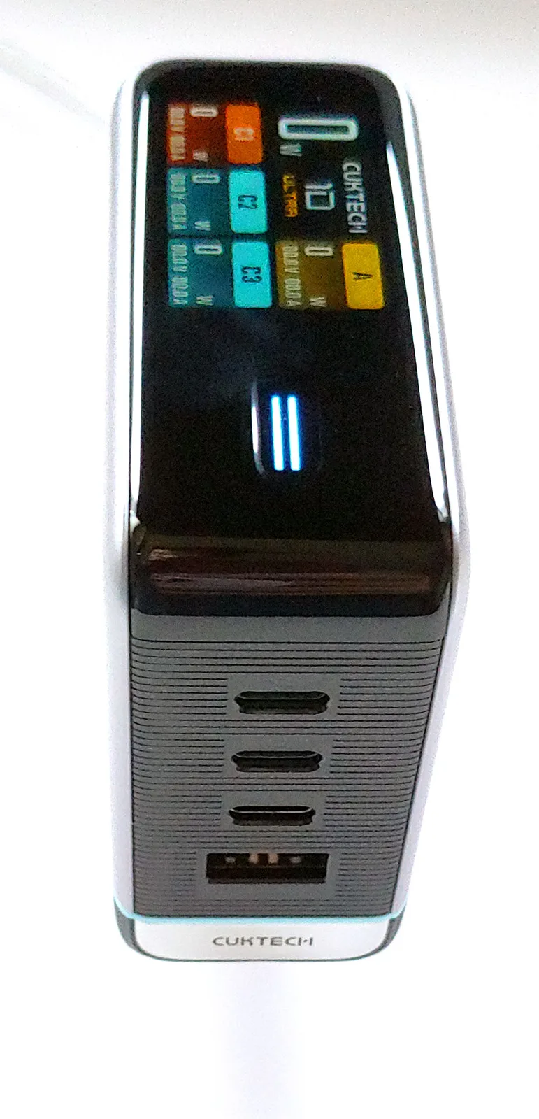 El Cuktech 10 Ultra carga rápidamente hasta cuatro dispositivos USB con una salida máxima de un solo puerto de 100W y una salida combinada de 110W. Su pantalla en color muestra la potencia, el voltaje y el amperaje por puerto en tiempo real para ayudar a controlar el progreso de la carga. Un botón táctil accede a varios modos de visualización y ajustes.