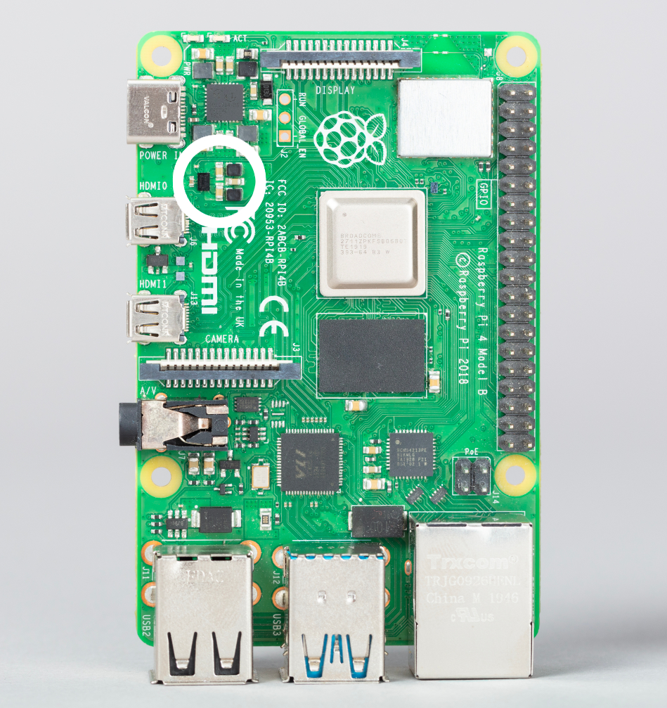 Puedes determinar si tu Raspberry Pi 4 contiene el nuevo SoC buscando tres puntos negros sobre la entrada de alimentación de la placa y la conexión HDMI 0. Estos puntos son la fuente de alimentación conmutada, que el SoC utiliza como su carril de tensión central.