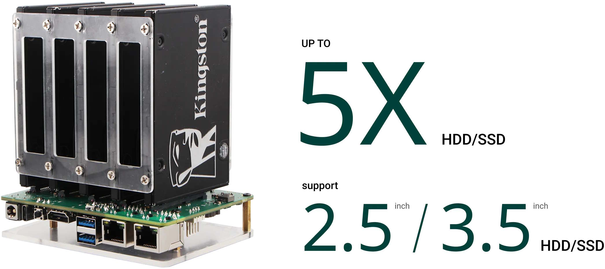 También se incluye una ranura para tarjetas microSD, que es donde normalmente se instalará el sistema operativo. Esto proporciona a los usuarios una gran flexibilidad, aunque también son responsables de instalar y actualizar el SO ellos mismos. Soporta RAID 0, 1, 5 y 10. Dispone de cabeceras GPIO. Dos puertos USB 3.2 Gen 1 también permiten conectar dispositivos de almacenamiento externos.