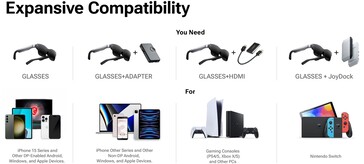 Las ligeras Air 2, que pesan 78 g (2,75 onzas), pueden conectarse a teléfonos, tabletas, videoconsolas y PC. Los dispositivos compatibles con DisplayPort (DP) sobre USB-C pueden conectarse directamente. La Nintendo Switch, los dispositivos que no sean DP y las fuentes de vídeo HDMI requieren adaptadores adicionales.