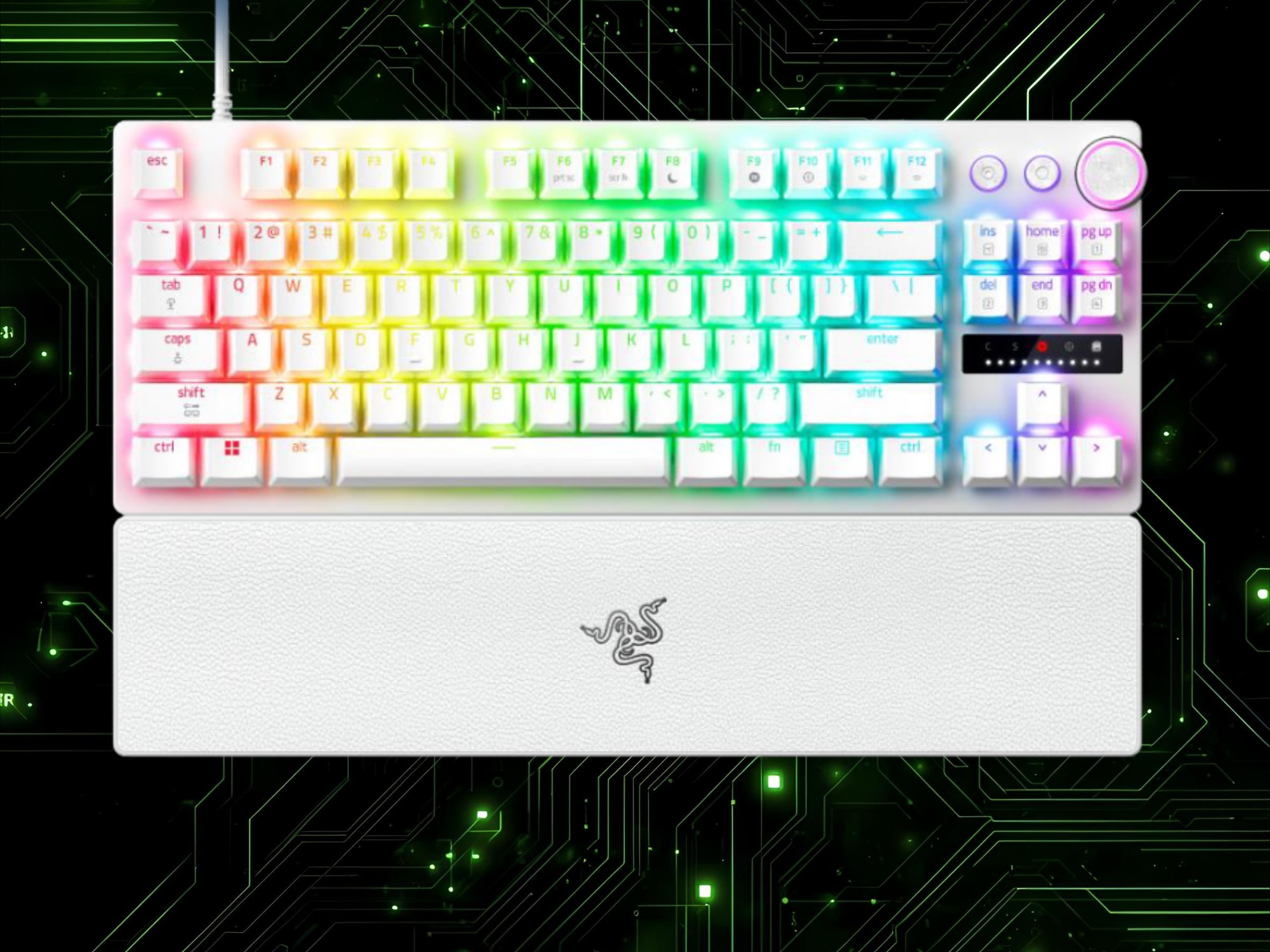 Las pruebas prácticas del modelo TKL confirmaron que reacciona a un toque de pluma. Sin embargo, con un rango de actuación de 0,1 mm a 4 mm, los ajustes más altos lo hacen más práctico para tareas de productividad. Los jugadores también pueden ajustar otras opciones, como Toque rápido y Rapid Trigger, sin necesidad de Sinapsis 4. El lado derecho del teclado con cable incluye controles multimedia reasignables y varios indicadores LED.