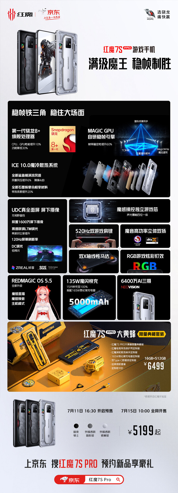Por último, RedMagic ha fijado la edición Bumblebee de 16/512 GB en 6.499 yuanes (~968 dólares). Por ese precio, viene con un refrigerador de aire, una caja, una placa y un 165W GaN de 165 W (que también se encuentra en todas las cajas de la serie 7S, a pesar de que la 7S es de 120W) en una caja de "edición de coleccionista". RedMagic abrirá los pedidos anticipados de sus nuevos teléfonos de gama alta Android 12 el 15 de julio de 2022.
