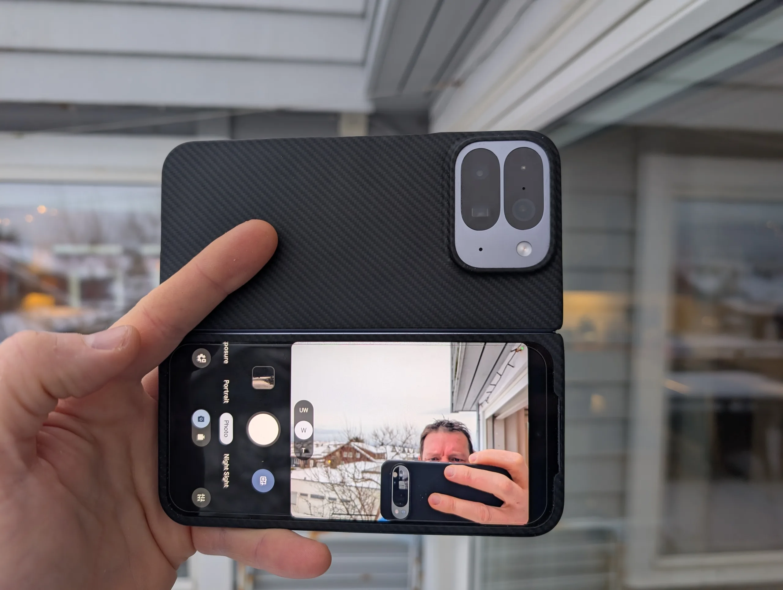 Dicho esto, uno de los mayores puntos de venta para mí, fue la posibilidad de utilizar las cámaras traseras como cámaras selfie cuando el dispositivo estaba desplegado. De nuevo, algo que sobre el papel puede resultar muy atractivo, pero que en la realidad es casi totalmente impracticable. Me llevó varias semanas desarrollar lo que yo llamo el agarre "cuernos del diablo". La única forma práctica de sujetar el teléfono y tomarse un selfie simultáneamente, reduciendo en cierto modo el riesgo de dejar caer una inversión de 1800 dólares.