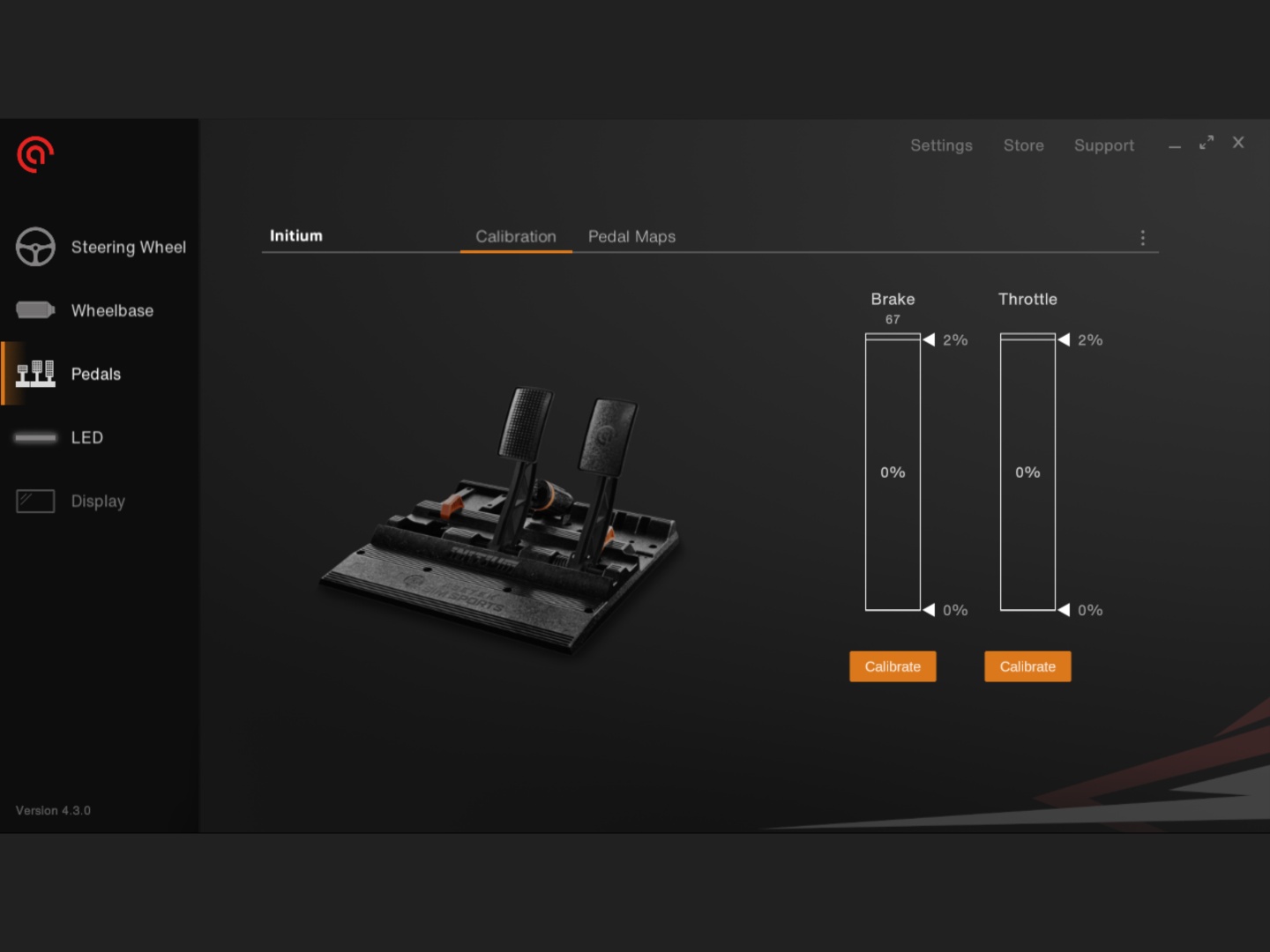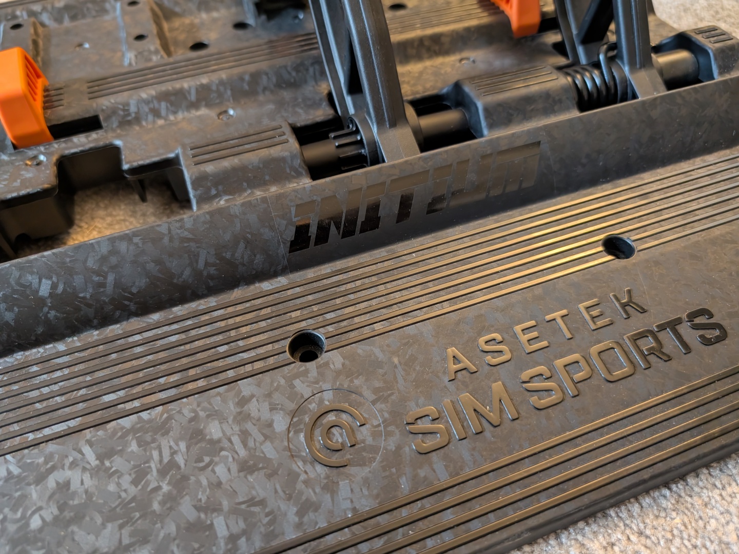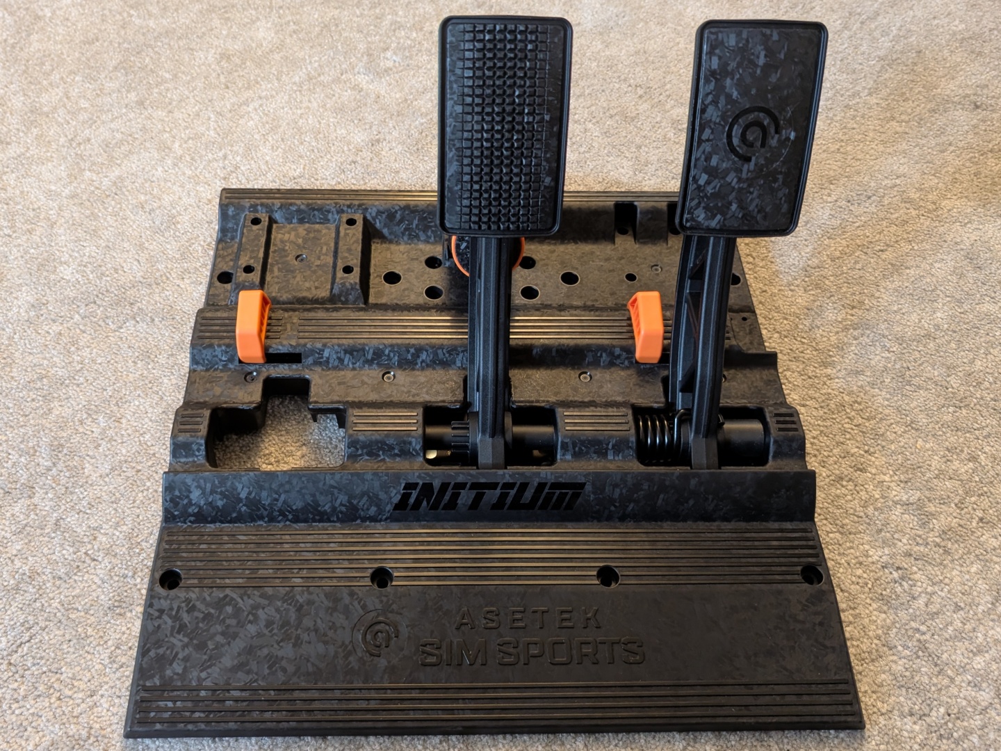 En cuanto a los pedales, Asetek ha incorporado al kit de pedales Initium lo aprendido con los kits de gama alta. Hay acelerador y freno con espacio para un pedal de embrague. Ambos utilizan sensores Hall para la entrada y el pedal de freno tiene un accionamiento por resorte de dos pasos. Los pedales también tienen un modo 'Cockpit' y otro 'Floor' que permite cambiar el ángulo del acelerador y el freno, dependiendo de cómo se esté utilizando. El juego de pedales está fabricado con material compuesto reforzado con fibra de vidrio y el acabado tiene muy buen aspecto.