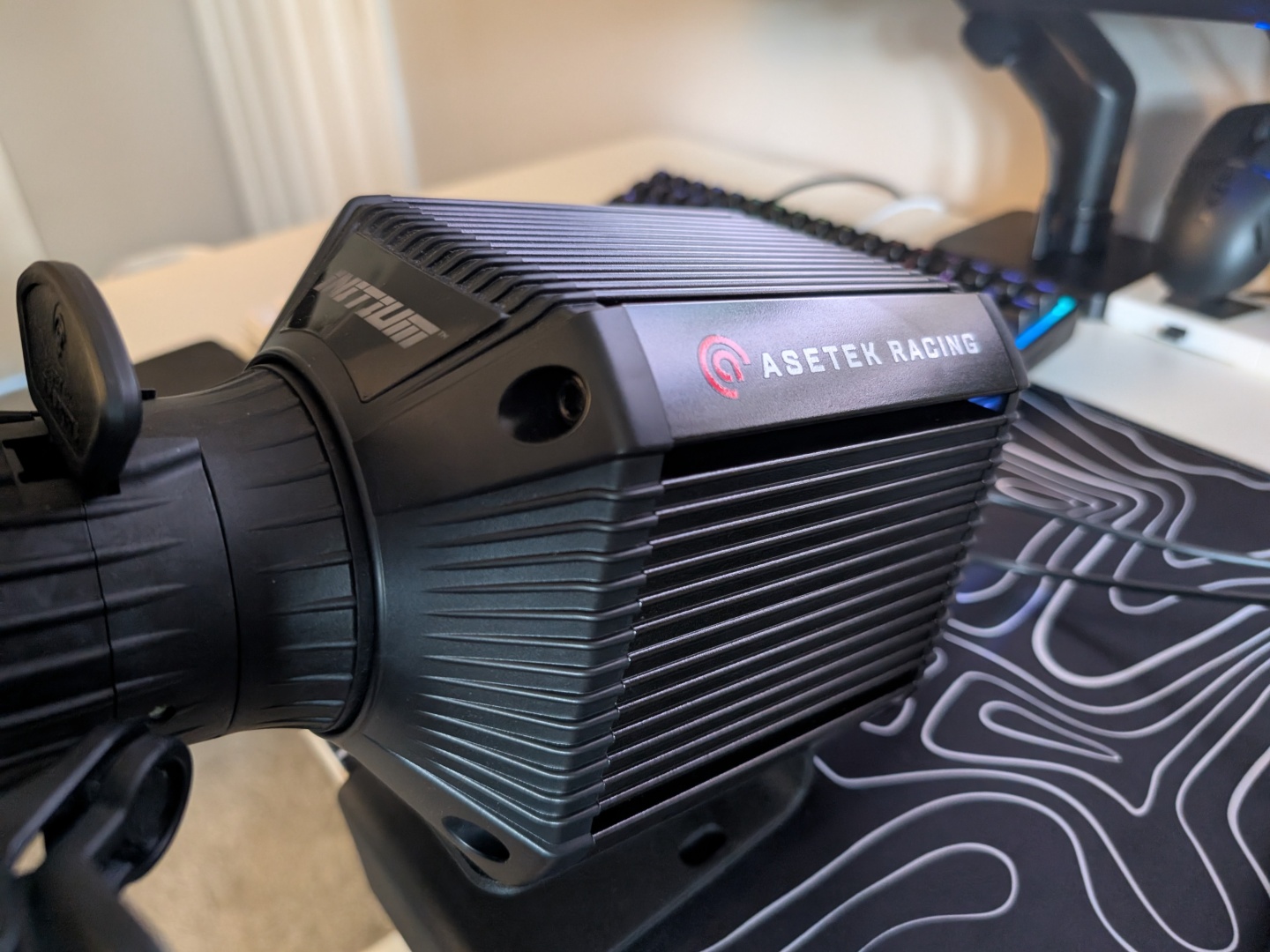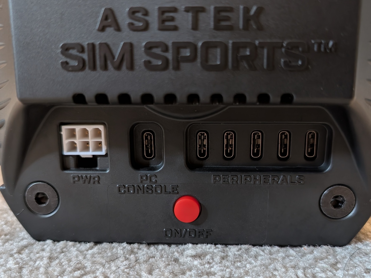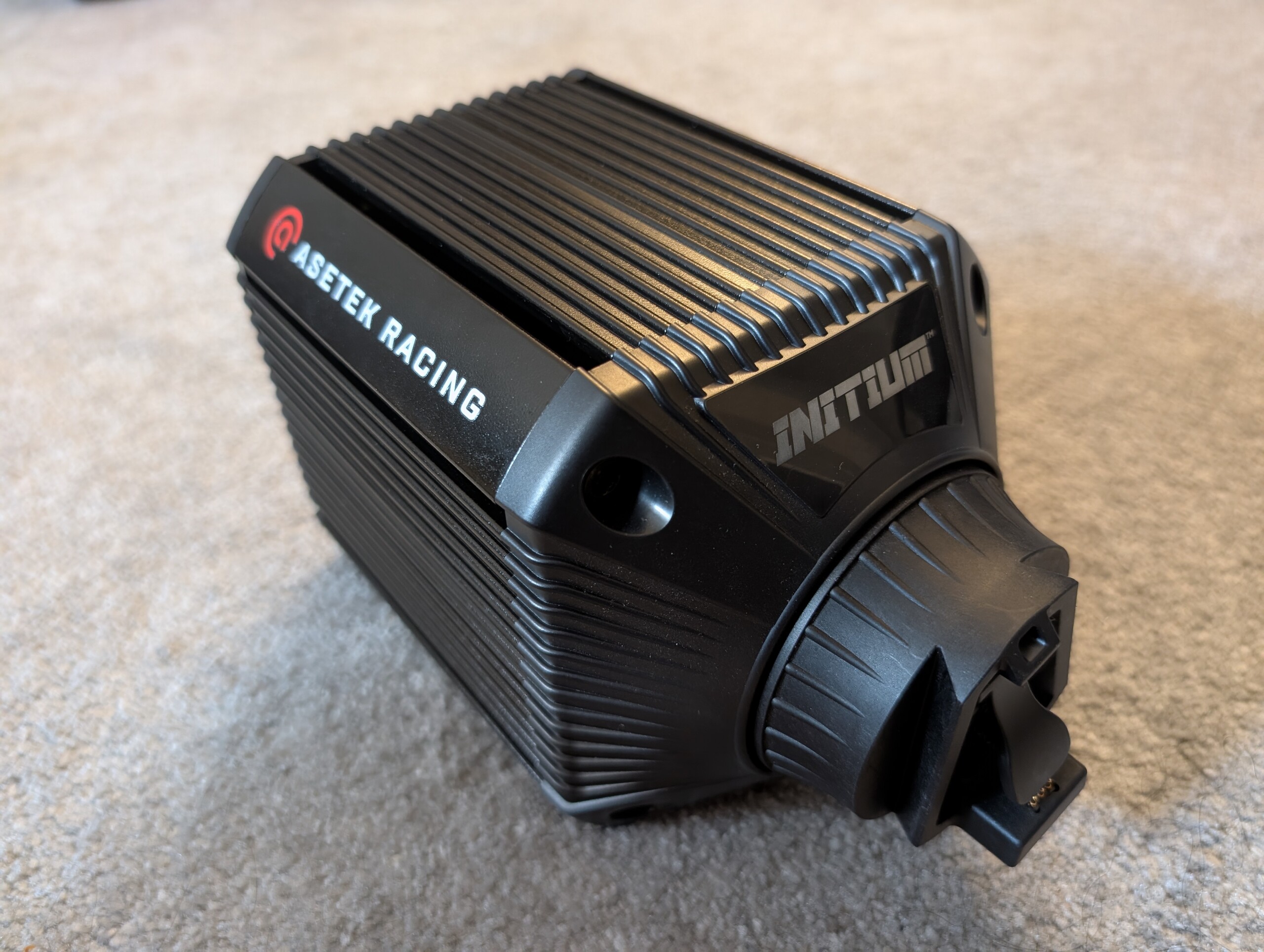 La distancia entre ejes de aluminio extruido es bastante pesada con 5,7 kg y eso se debe a que alberga hasta 8 Nm de par de transmisión directa, aunque el paquete estándar incluye un adaptador que sólo permite 5,5 Nm. No es un compromiso, ya que está perfectamente en línea con la Moza R5 de precio similar (consulte nuestra reseña) y Thrustmaster T598-P, así como con el paquete más caro Fanatec CSL DD QR2. También hay un mecanismo de liberación rápida con el que tuvimos problemas al principio, pero que mejoró con el tiempo. El volante se quedaba bloqueado en su sitio y no salía tan fácilmente como se supone que debe hacerlo con la "liberación rápida" Nos pusimos en contacto con Asetek y nos recomendaron dar un golpe firme en el volante para separarlo. Al parecer, esto es un problema con las primeras conexiones, pero se hace más fácil y suave con los intentos posteriores.