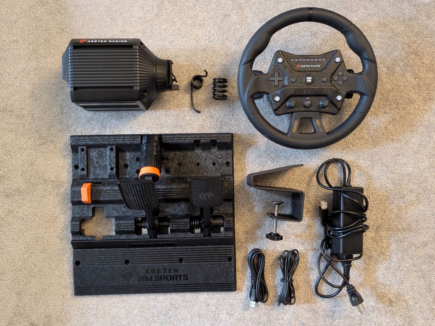 Para ser un paquete, el kit Initium de Asetek viene en cajas individuales para la base, el volante y los pedales. Los paquetes de Moza, Turtle Beach y otros suelen venir en una sola caja, por lo que son mucho más fáciles de guardar cuando no se utilizan. En cuanto al embalaje, todo está protegido con espuma y es fácil de montar. La tornillería de montaje, la abrazadera de escritorio y los cables también están bien ordenados. Asetek también proporciona muelles adicionales para el freno y el acelerador para aumentar su rigidez.