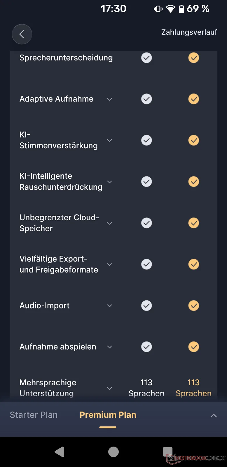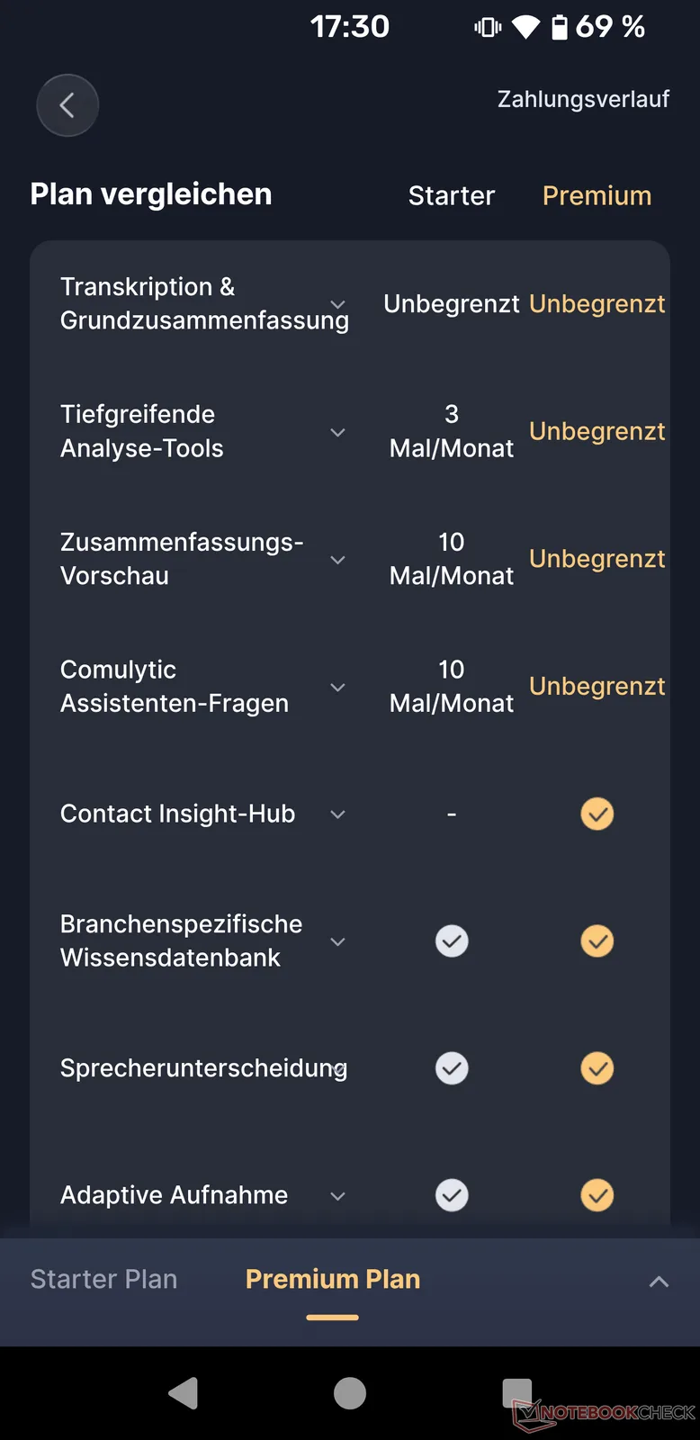 Más importante es el cambio en la generación de IA, que se aleja del resumen adaptativo de conversaciones y se orienta hacia tareas más específicas para corredores de bolsa, vendedores, profesionales del marketing, profesionales médicos, periodistas, abogados, gestores de activos, cazatalentos, agentes de seguros, etc: Las plantillas seleccionables incluyen lluvias de ideas, reuniones de equipo, análisis de ventas, análisis de clientes, creación de informes para vendedores o compradores, comentarios sobre visitas, sesiones de terapia, transcripciones de audiencias, transcripciones judiciales, entrevistas, artículos de prensa, incorporación de clientes, análisis financieros y muchas más. Si desea utilizar el dispositivo específicamente en su profesión, la función Premium tiene mucho sentido. Tras activar la aplicación por primera vez como nuevo usuario, Premium se desbloquea gratuitamente durante 90 días. Después, Premium cuesta 14,99 $ al mes o 119,99 $ al año (aprox. 10 $/mes).