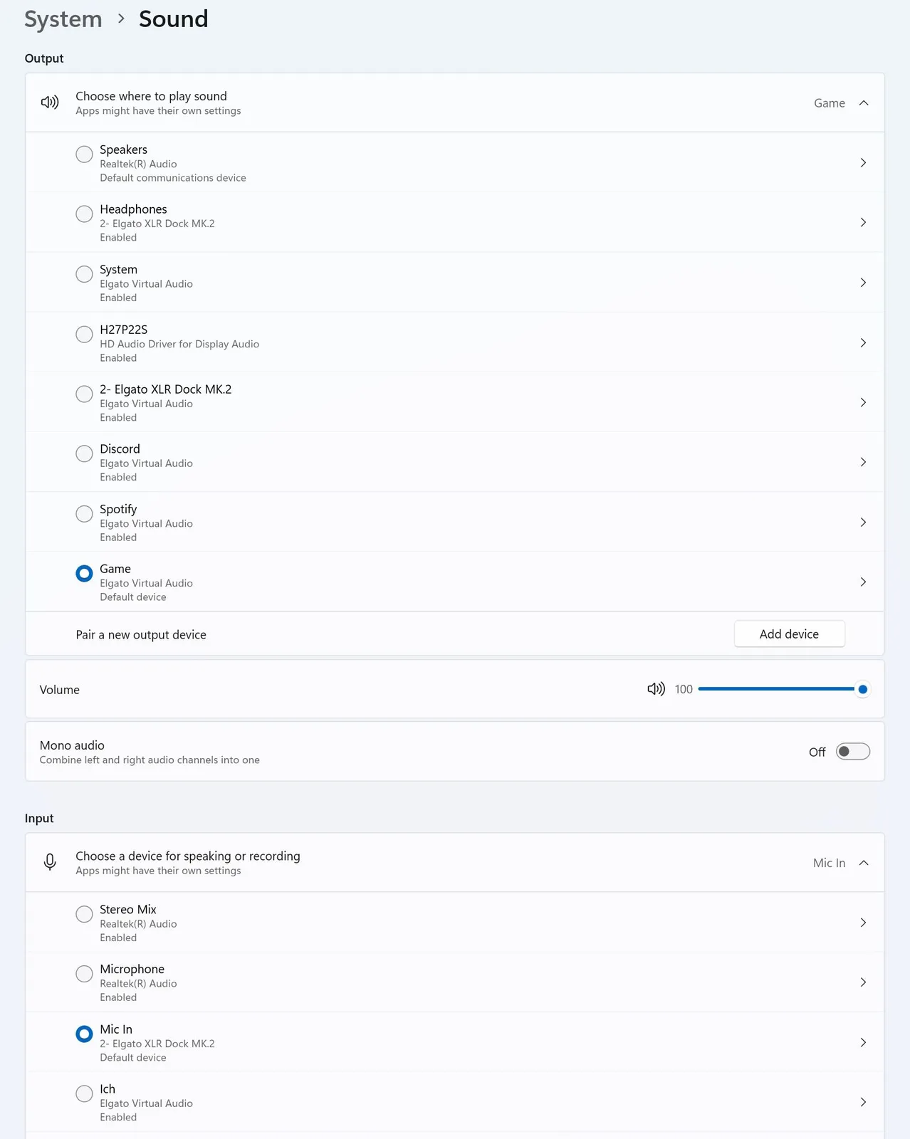 Estas mezclas aparecen como dispositivos de entrada en el sistema y pueden seleccionarse y conmutarse fácilmente dentro de aplicaciones como OBS. Esto le permite, por ejemplo, alternar entre una mezcla de entrada de streaming y una mezcla de chat directamente en OBS.