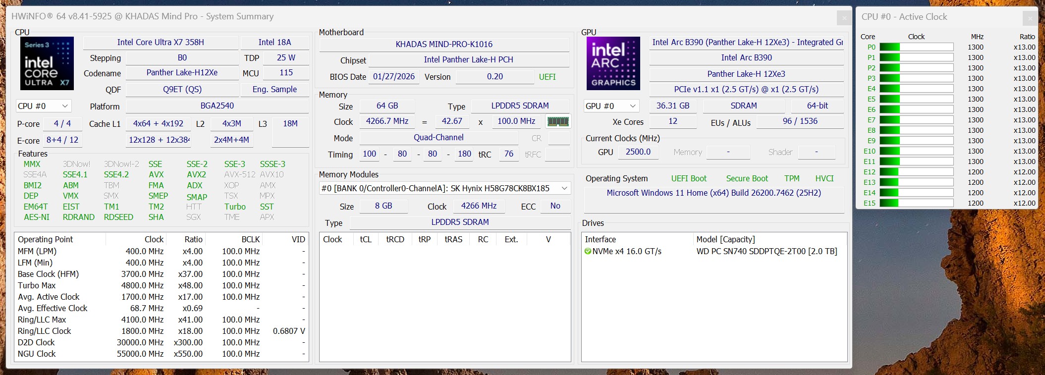 | Khadas Mind Pro Intel Core Ultra X7 358H ⎘ Intel Arc B390 12 Xe3 Panther Lake iGPU ⎘ 64 GB Memoría, 2048 GB SSD | Precio de catálogo: 1799€ | 566 g | 105 x 146 x 58 mm | |