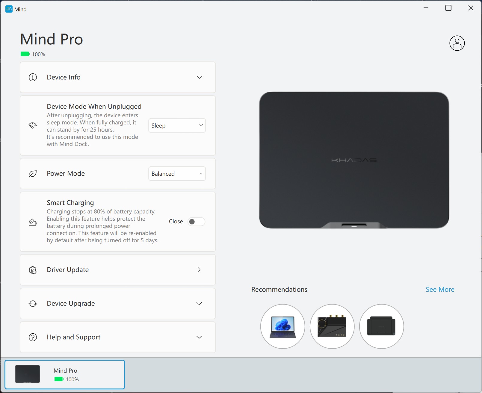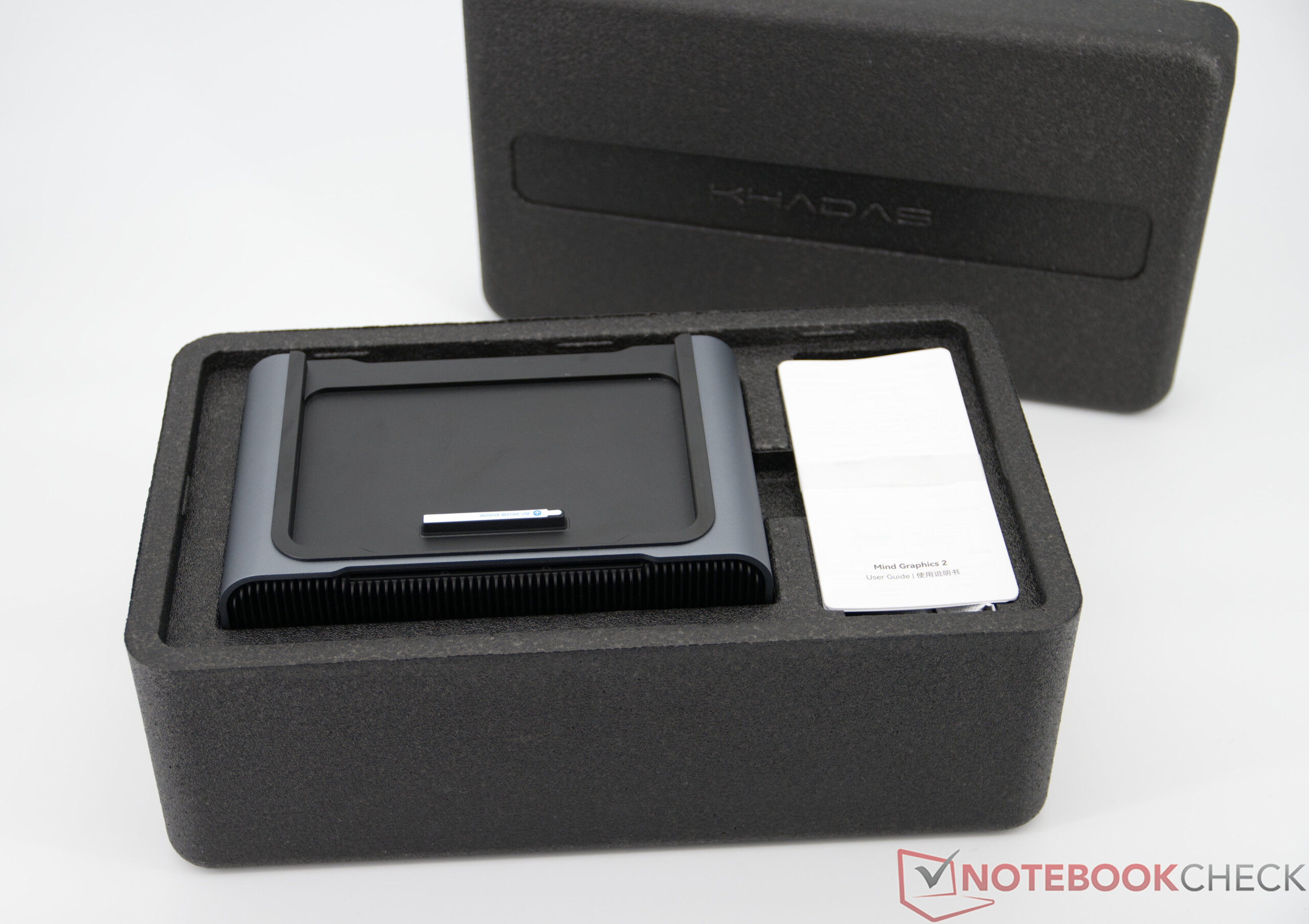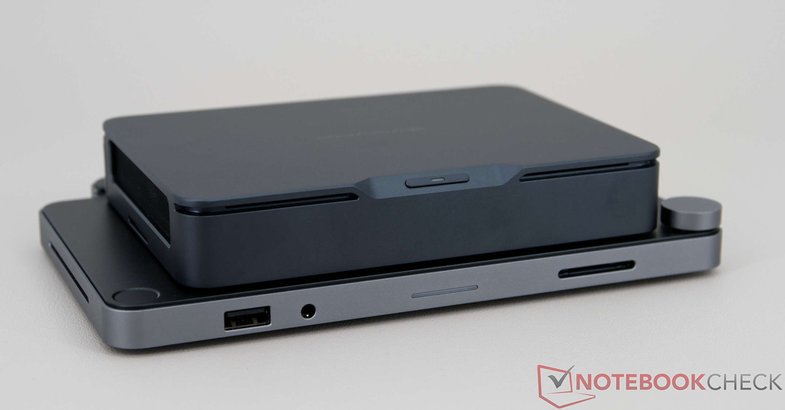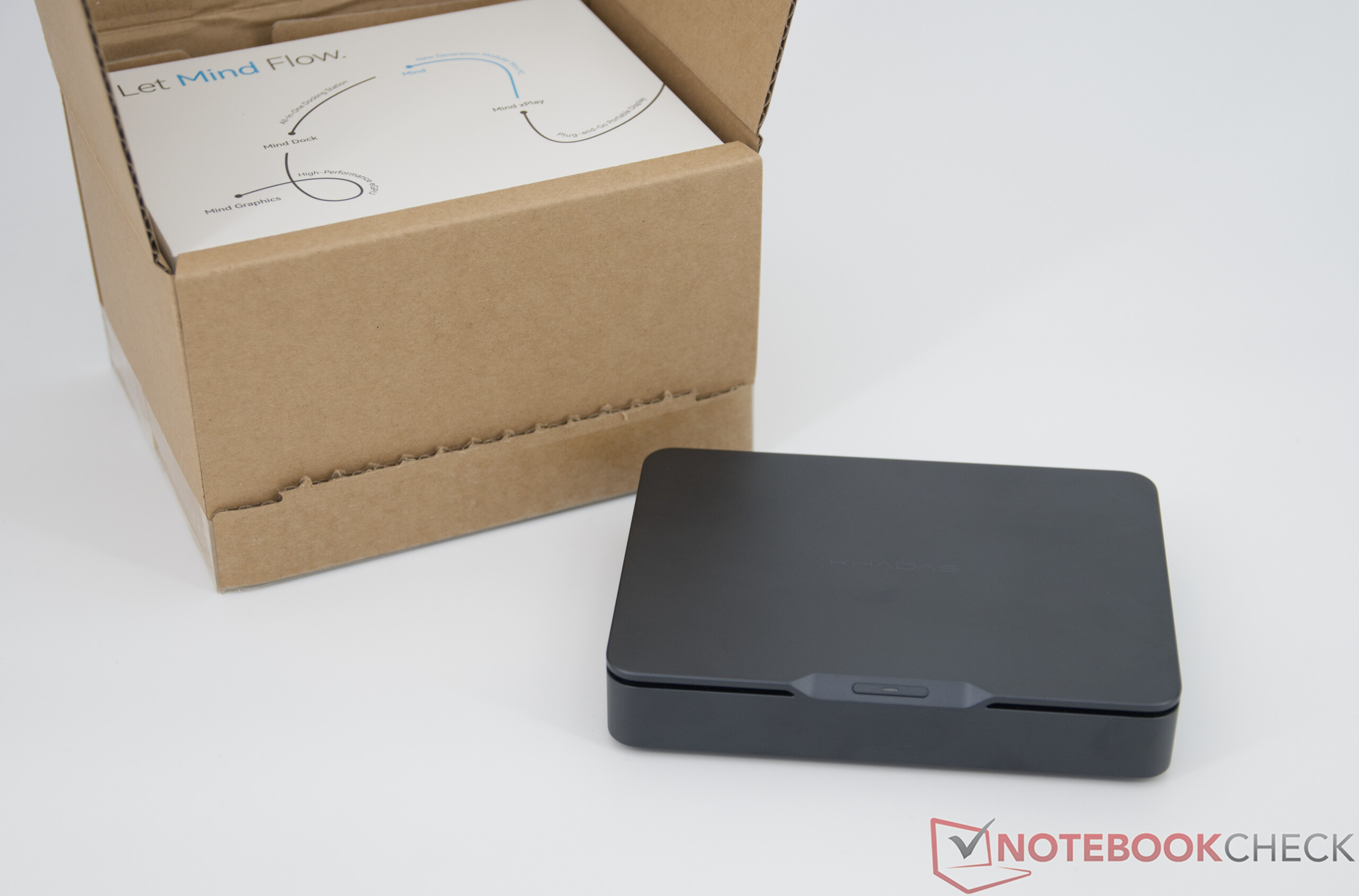 El volumen de suministro es deliberadamente minimalista: el embalaje sólo contiene el propio mini PC y una fuente de alimentación de 100 vatios, incluido un cable USB-C. Los accesorios opcionales como el Mind Dock, la funda de piel Mind o el Mind Graphics 2 Dock deben adquirirse por separado. Con el Mind xPlay, el mini PC puede convertirse en una especie de sustituto del ordenador portátil, lo que significa que el fabricante cubre casi todos los escenarios de aplicación imaginables.