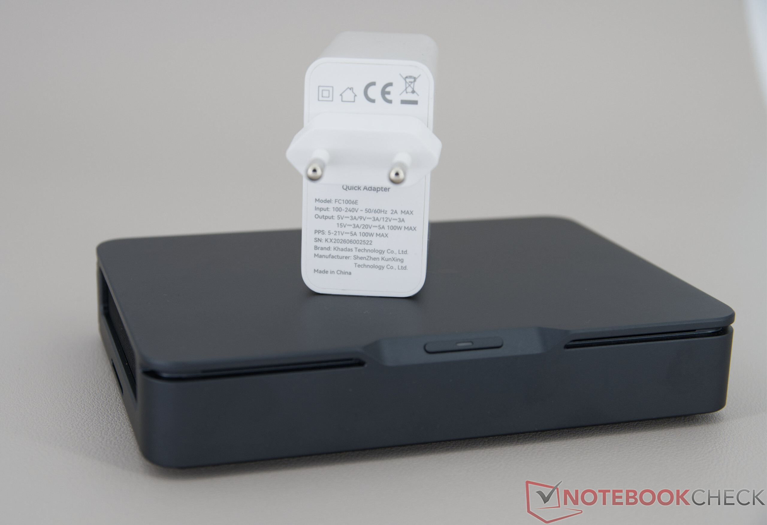 El Khadas Mind Pro se suministra con una fuente de alimentación de 100 vatios, que ofrece reservas suficientes para el sistema más potente. En modo inactivo, el consumo de energía oscila entre unos 6,7 y 11,5 vatios en función del estado de carga, mientras que bajo carga se mide una media de unos 53 vatios. Durante periodos cortos, el consumo puede elevarse a unos 64,4 vatios, pero esto no supone ningún reto para la fuente de alimentación. En general, el mini PC demostró ser extremadamente eficiente en la prueba y pudo situarse por delante de todos los dispositivos de la comparación.