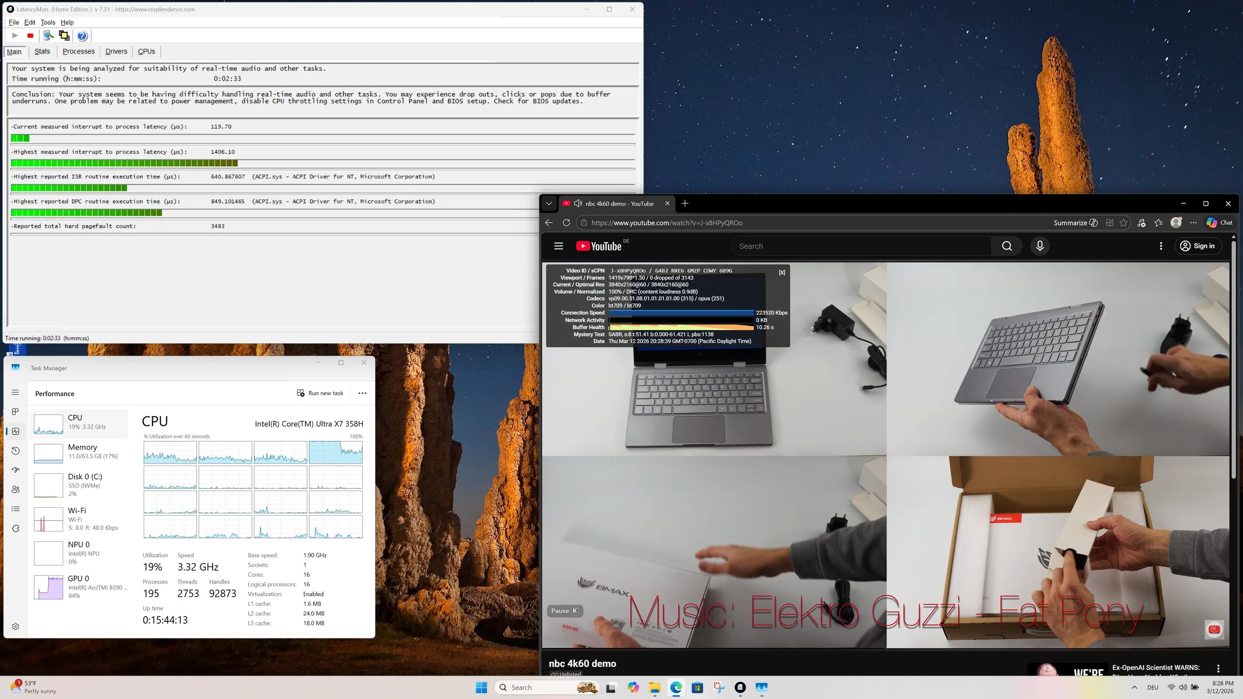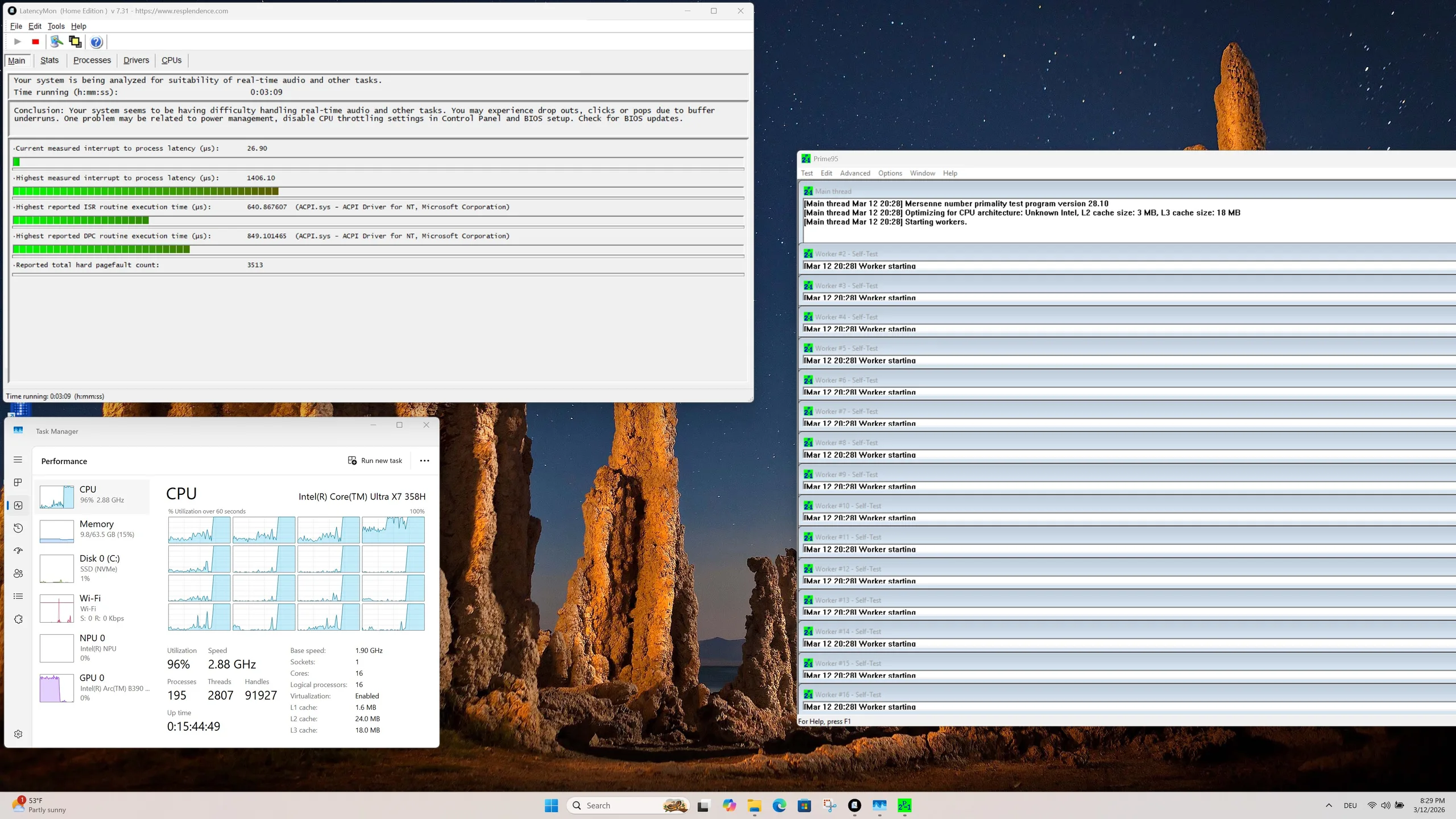 El rendimiento del Intel Core Ultra X7 358H desciende ligeramente bajo carga sostenida, lo que puede observarse fácilmente en el multibucle Cinebench R15. De media, el procesador trabaja con un consumo de energía de unos 45 vatios, mientras que las temperaturas pueden elevarse hasta 97 C en el pico.