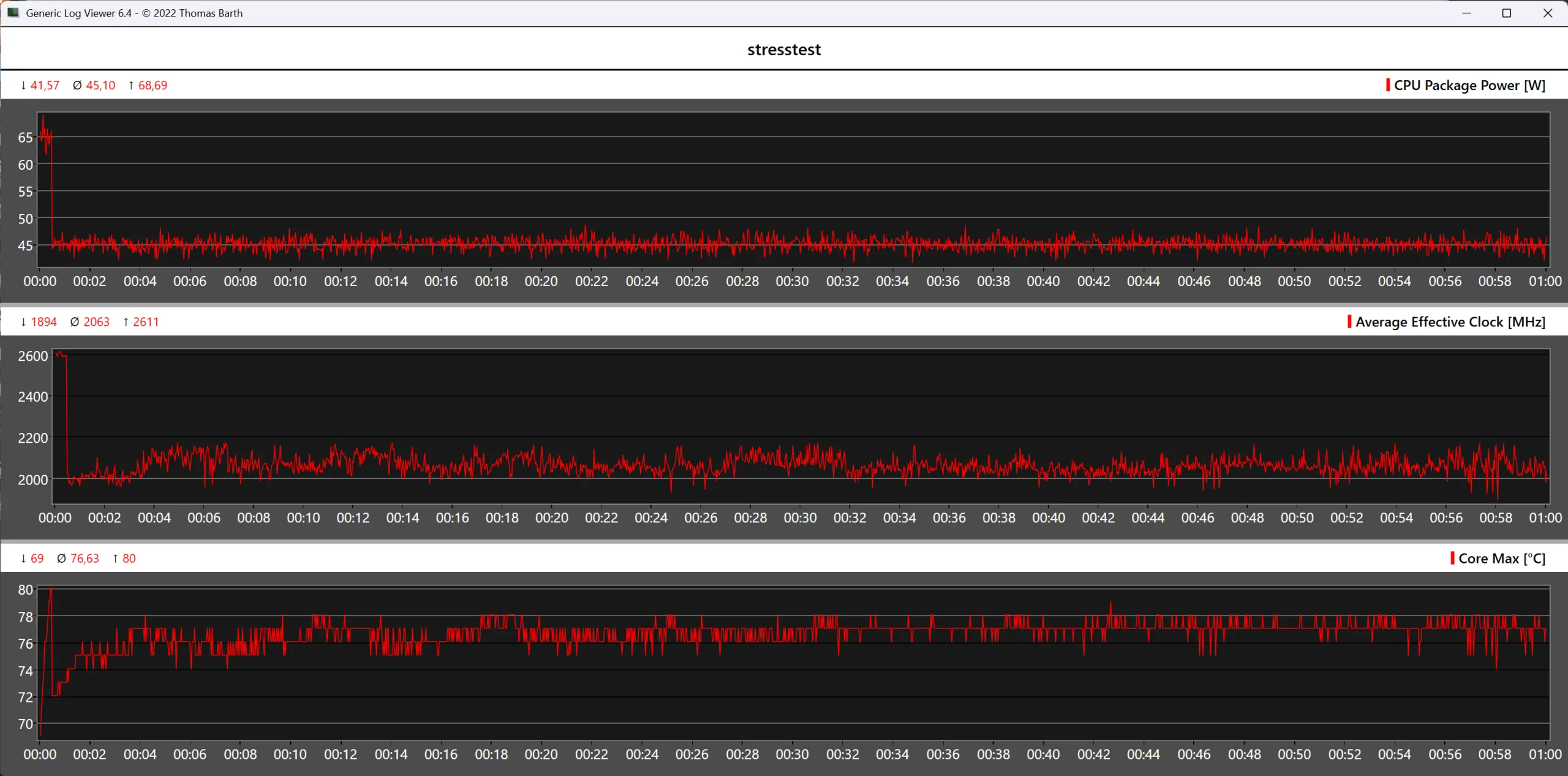 En la prueba de estrés, el Intel Core Ultra X7 358H alcanza brevemente temperaturas de hasta 80 C, lo que sigue siendo poco crítico teniendo en cuenta la temperatura máxima publicada por Intel. Con un consumo medio de energía de unos 45 vatios, la temperatura de la CPU se estabilizó entonces en torno a los 76 C. Sin embargo, el SoC se calentó un poco más en la prueba múltiple Cinebench R15 (97 C).