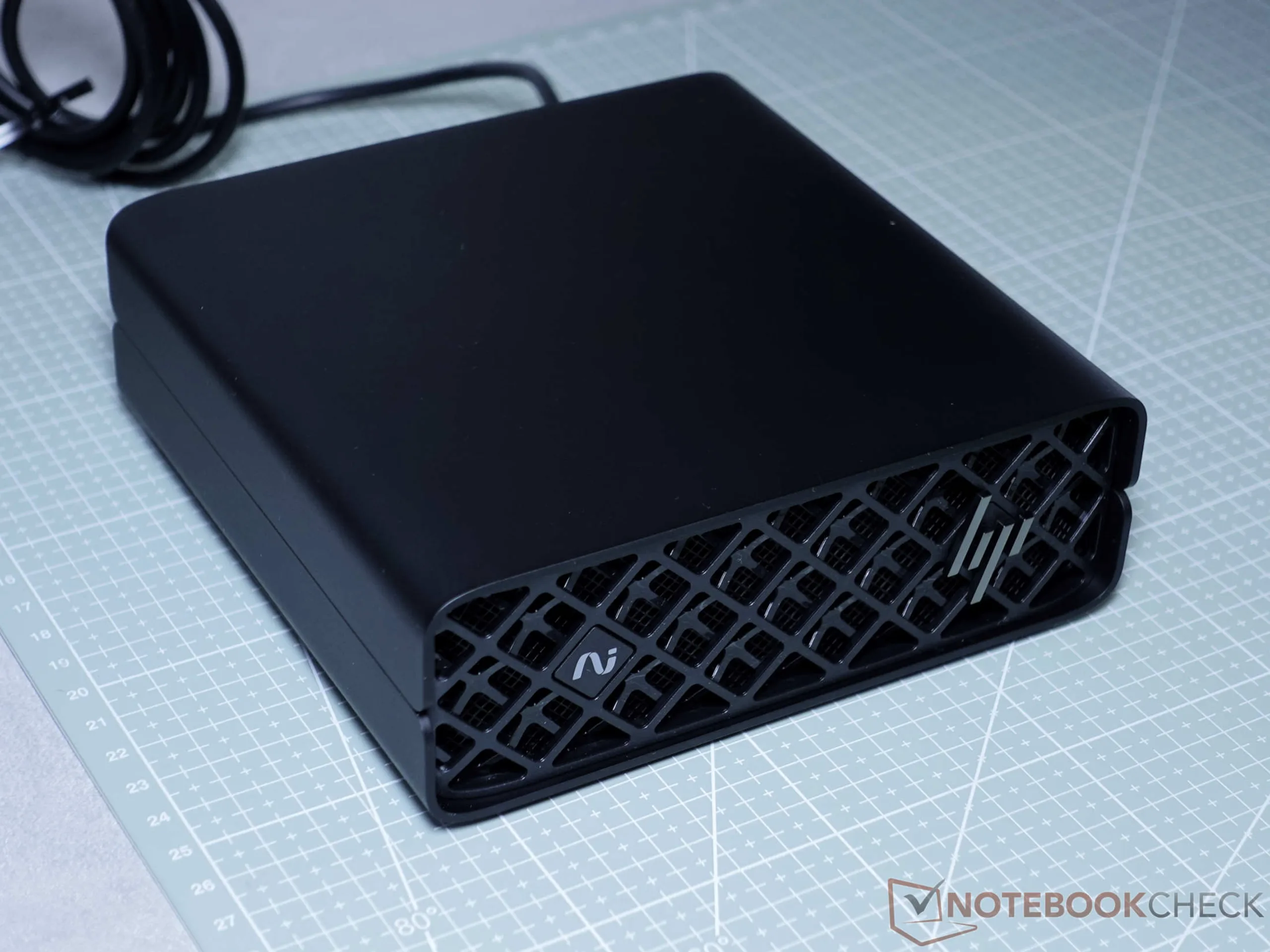 La estación AI HP ZGX Nano G1n presenta un factor de forma extremadamente compacto con unas dimensiones de aproximadamente 15 × 15 × 5,5 cm y un peso de tan sólo 1,25 kg. Esto hace que sea fácil de acomodar en cualquier escritorio. La parte frontal es llamativa, ya que está formada casi en su totalidad por un distintivo diseño de rejilla para garantizar un flujo de aire óptimo para los potentes componentes internos. El logotipo de HP y un discreto logotipo "AI" están integrados aquí.