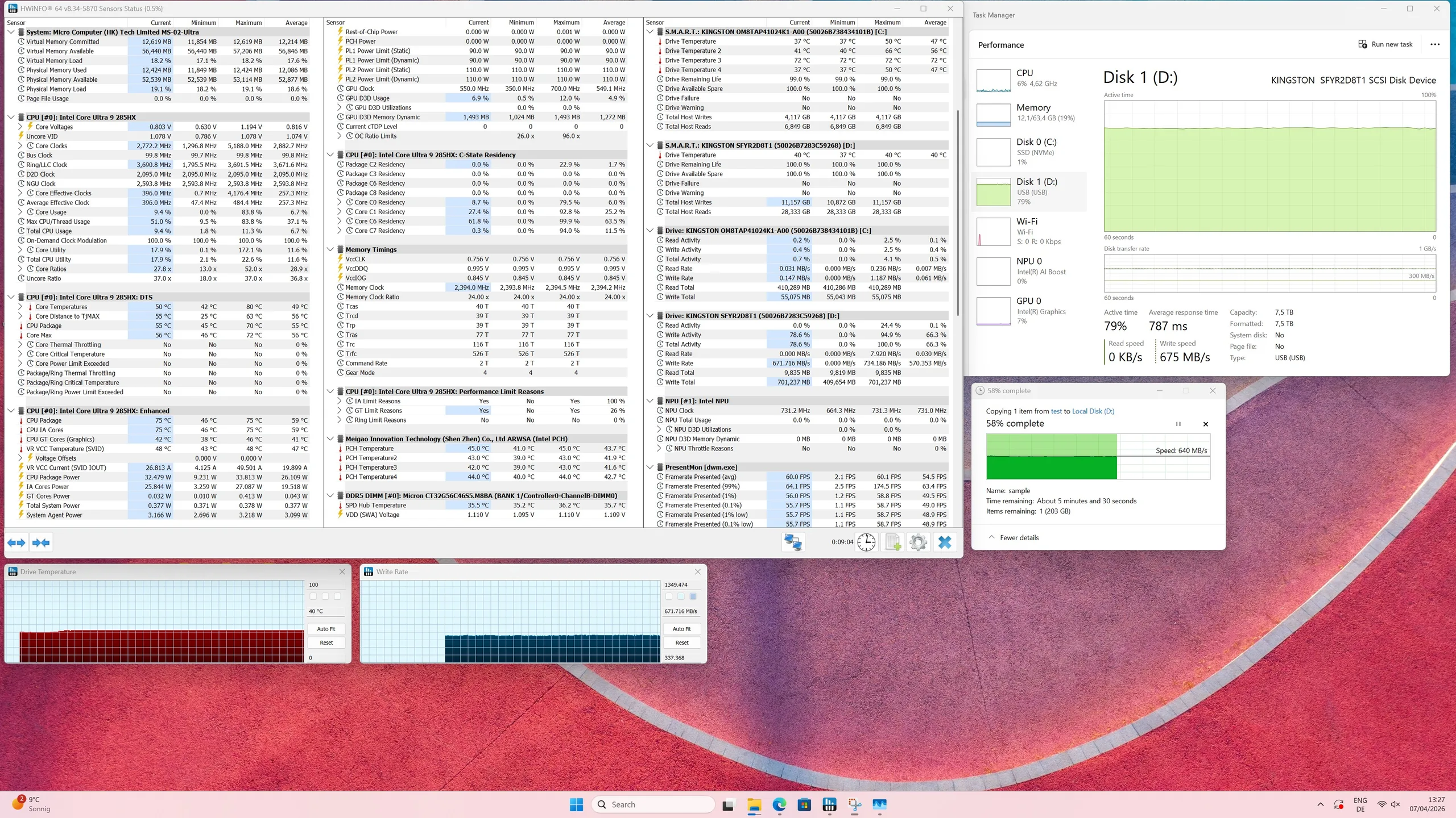 En la prueba de temperatura y estrés, la SSD TerraMaster D1 emparejada con la Kingston Fury Renegade G5 de 8 TB ofrece unos resultados convincentes. Incluso bajo carga sostenida, las temperaturas se mantienen dentro de un rango seguro gracias a la carcasa de aluminio y a la eficaz refrigeración. No hay caídas de rendimiento ni signos de ralentización, lo que garantiza unas tasas de transferencia constantes.