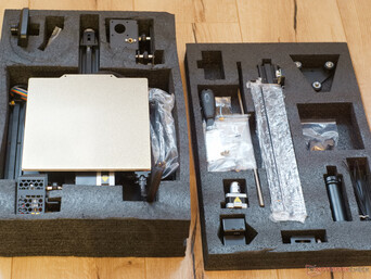 El número de componentes individuales en la caja del Voxelab Aquila S2 puede parecer abrumador al principio. Sin embargo, gracias a las instrucciones ilustradas, la configuración es posible en aproximadamente 45 minutos. Las piezas pequeñas, como los tornillos, están bien clasificadas según su tamaño. La impresora 3D viene con las herramientas necesarias para el montaje. El paquete también incluye una boquilla de repuesto y una aguja para limpiar la boquilla de filamento. También se incluye un recambio para las patas de goma que se fijan con cinta adhesiva de doble cara. Nuestro dispositivo de prueba también incluía varios filamentos para las pruebas; normalmente, Voxelab sólo suministra 50 gramos de PLA. Lo cual es apenas suficiente para las primeras calibraciones