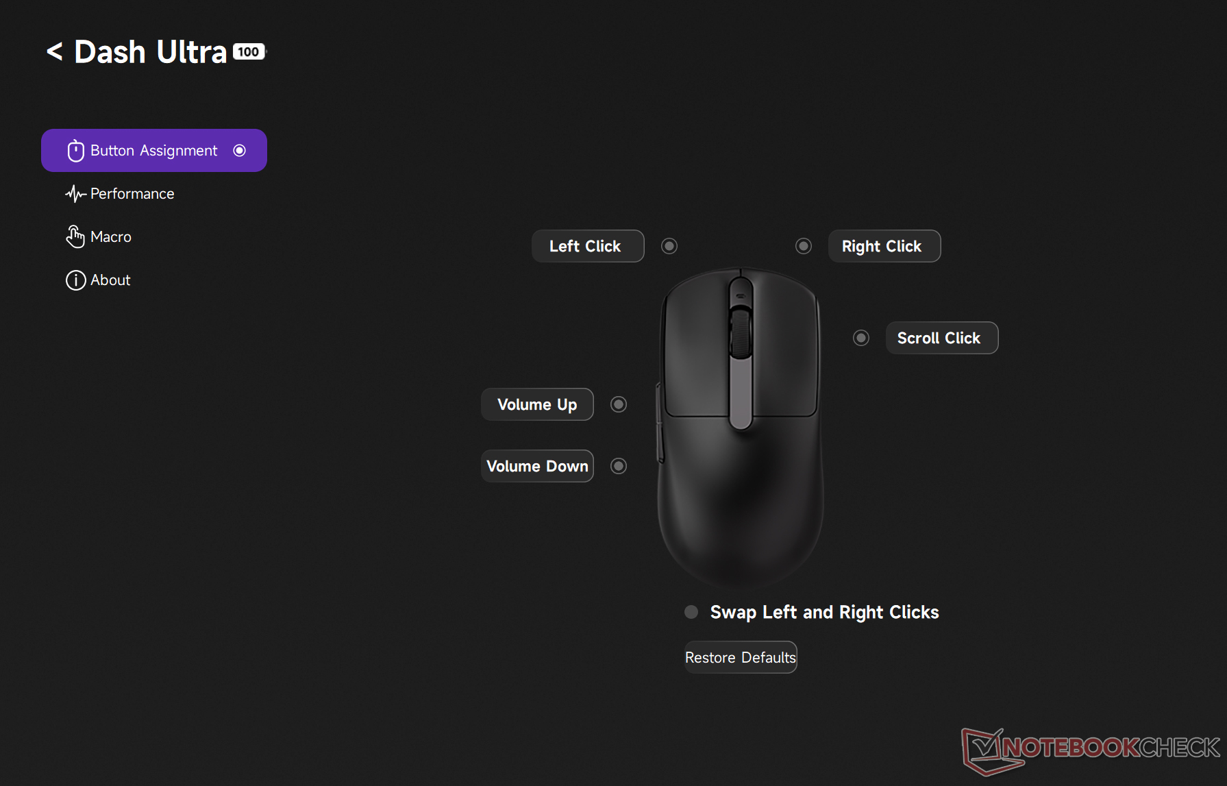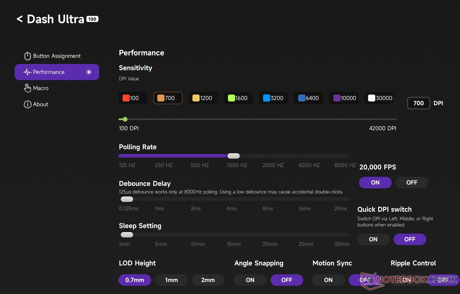Todos los botones principales del ratón inalámbrico para juegos pueden remapearse, y en la sección "Rendimiento" hay una opción que permite cambiar rápidamente de DPI. Los usuarios también pueden activar el ajuste angular, lo que permite movimientos en línea recta más nítidos que pueden dar una ventaja competitiva en los juegos FPS.