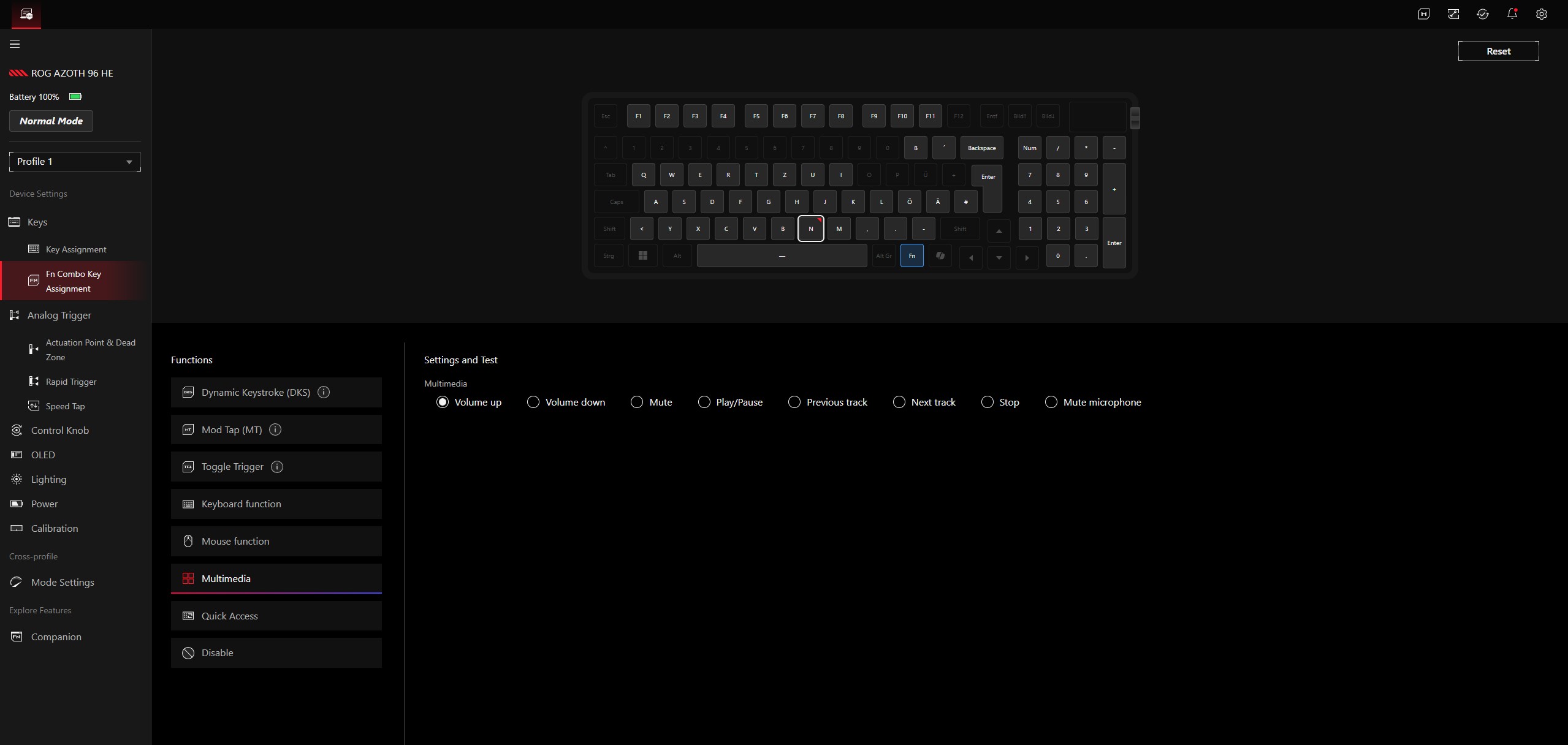 El Asus ROG Azoth 96 HE se gestiona y configura a través de Gear Linkque utiliza una interfaz web claramente estructurada. No es necesario instalar una aplicación adicional (Gear Link Companion), pero habilita algunas funciones extra. La gama de opciones es amplia; por ejemplo, puede crear varios perfiles. Se pueden asignar diferentes funciones a casi todas las teclas, y también se admiten acciones independientes para pulsar y mantener pulsadas. Además, se pueden activar distintas funciones dependiendo de cuánto se pulse una tecla. Las teclas Fn pueden utilizarse para asignar controles multimedia, entre otras cosas. Gear Link también permite establecer un punto de accionamiento individual para cada tecla.