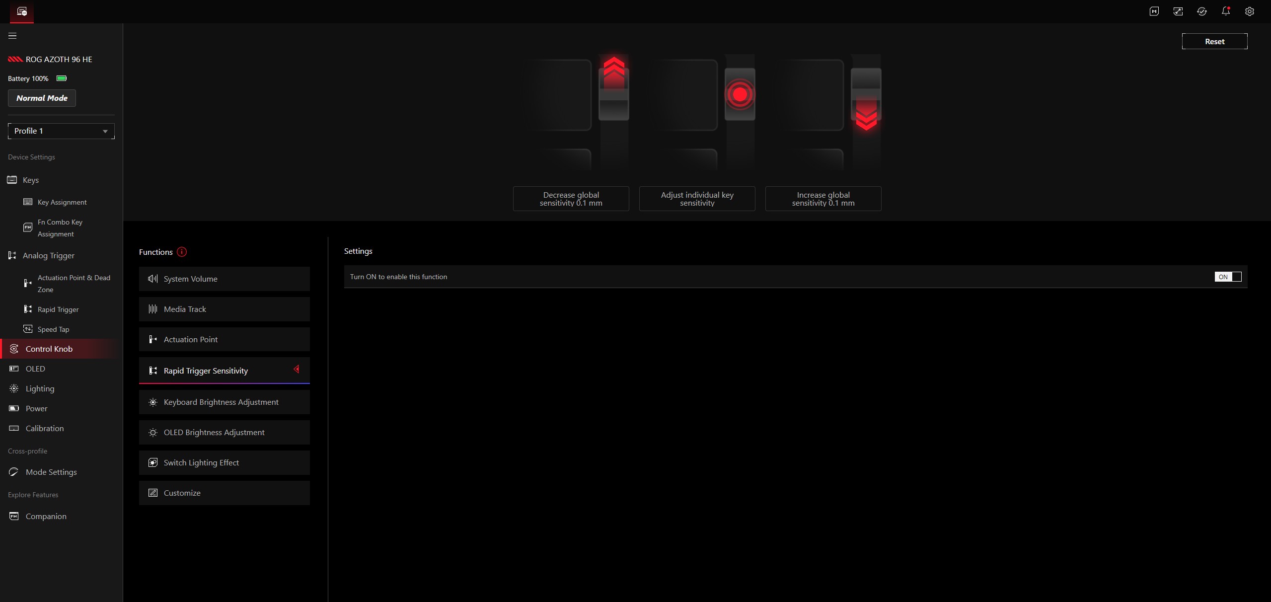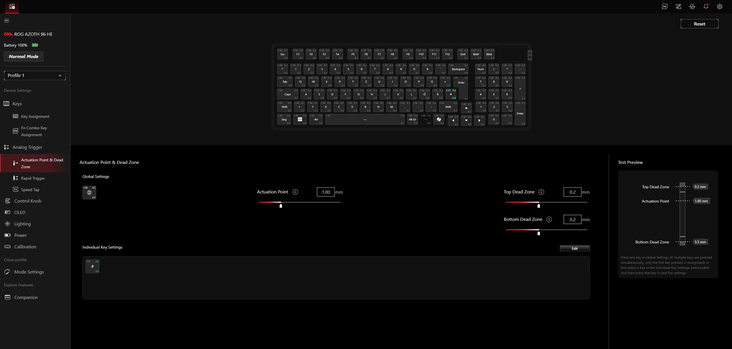 El ROG Azoth 96 HE se comporta de forma excelente en el uso diario, en aplicaciones productivas y en juegos. Recomendamos explícitamente tomarse un tiempo para ajustar la profundidad de actuación óptima - esta ajustabilidad es una gran ventaja sobre un teclado convencional y hace posible en la práctica encontrar el mejor equilibrio entre actuación rápida y evitar entradas accidentales. El punto de accionamiento puede ajustarse en pasos de 0,01 mm dentro de un rango de 0,1 a 3,5 mm.
